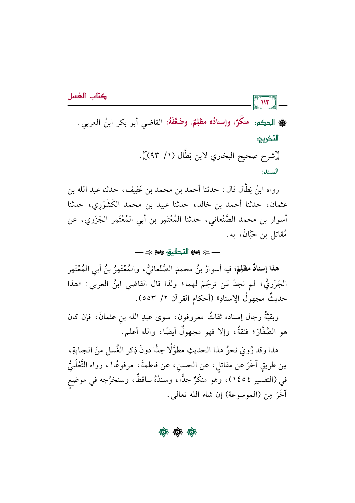 هذا وقد رُويَ نحوُ هذا الحديثِ مطوَّلًا جدًّا دونَ ذِكر الغُسل منَ الجنابةِ، مِن طريقٍ آخَرَ عن مقاتلٍ، عن الحسنِ، عن فاطمةَ، مرفوعًا! ، رواه الثَّعْلَبيُّ في (التفسير ١٤٥٤)، وهو منكَرٌ جدًّا، وسندُهُ ساقطٌ، وسنخرِّجه في موضعٍ آخَرَ مِن (الموسوعة) إن شاء الله تعالى.