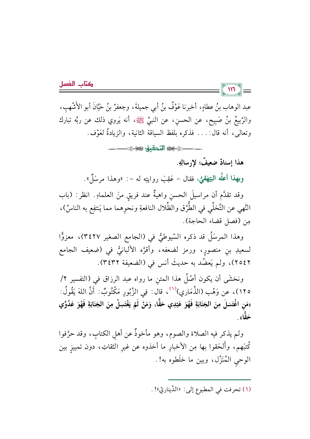 ونخشَى أن يكون أصْلُ هذا المتنِ ما رواه عبد الرزاق في (التفسير ٢/ ١٢٥)، عن وَهْب (الذِّمَاري) (¬١)، قال: فِي الزَّبُورِ مَكْتُوبٌ: أَنَّ اللهَ يَقُولُ: ((مَنِ اغْتَسَلَ مِنَ الجَنَابَةِ فَهُوَ عَبْدِي حَقًّا، وَمَنْ لَمْ يَغْتَسِلْ مِنَ الجَنَابَةِ فَهُوَ عَدُوِّي حَقًّا)).