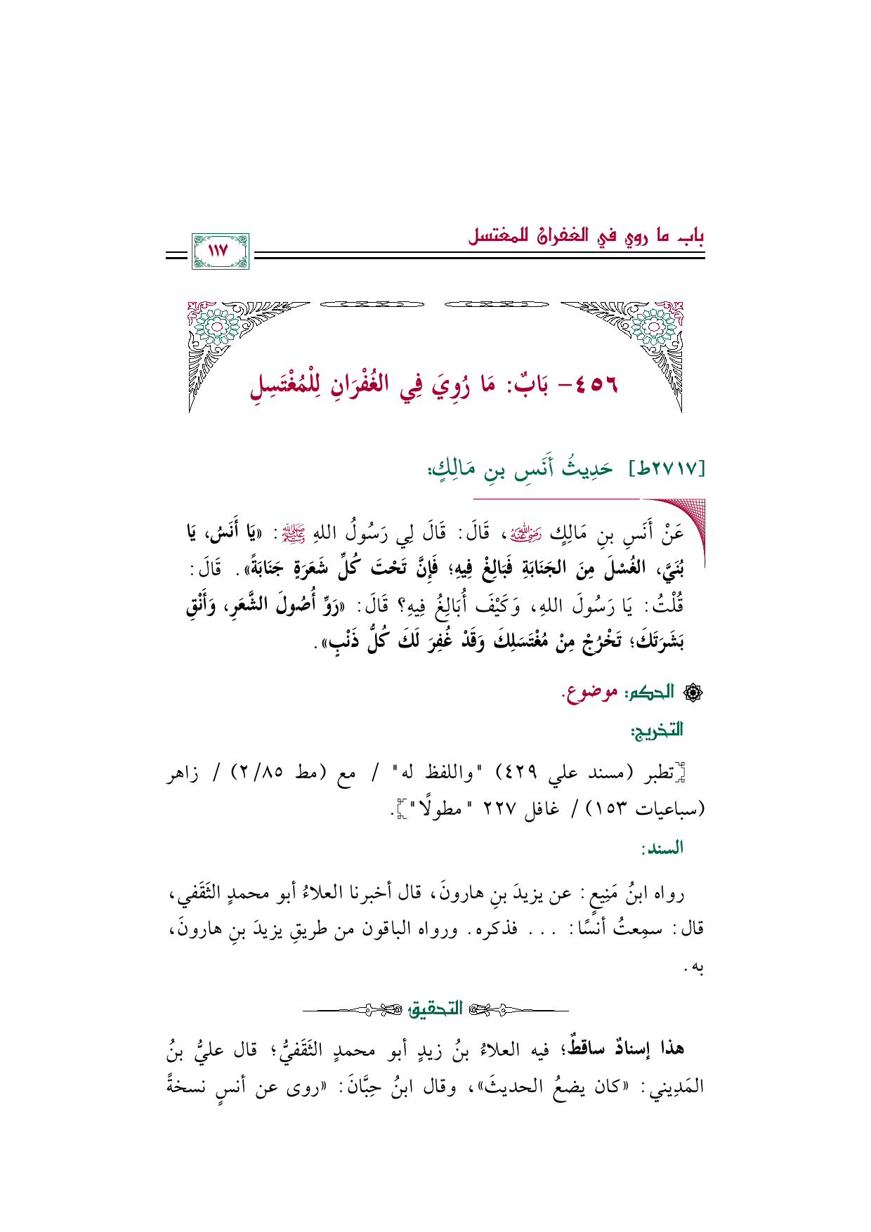 رواه ابنُ مَنِيعٍ: عن يزيدَ بنِ هارونَ، قال أخبرنا العلاءُ أبو محمدٍ الثَقَفي، قال: سمِعتُ أنسًا: ... فذكره. ورواه الباقون من طريقِ يزيدَ بنِ هارونَ، به.