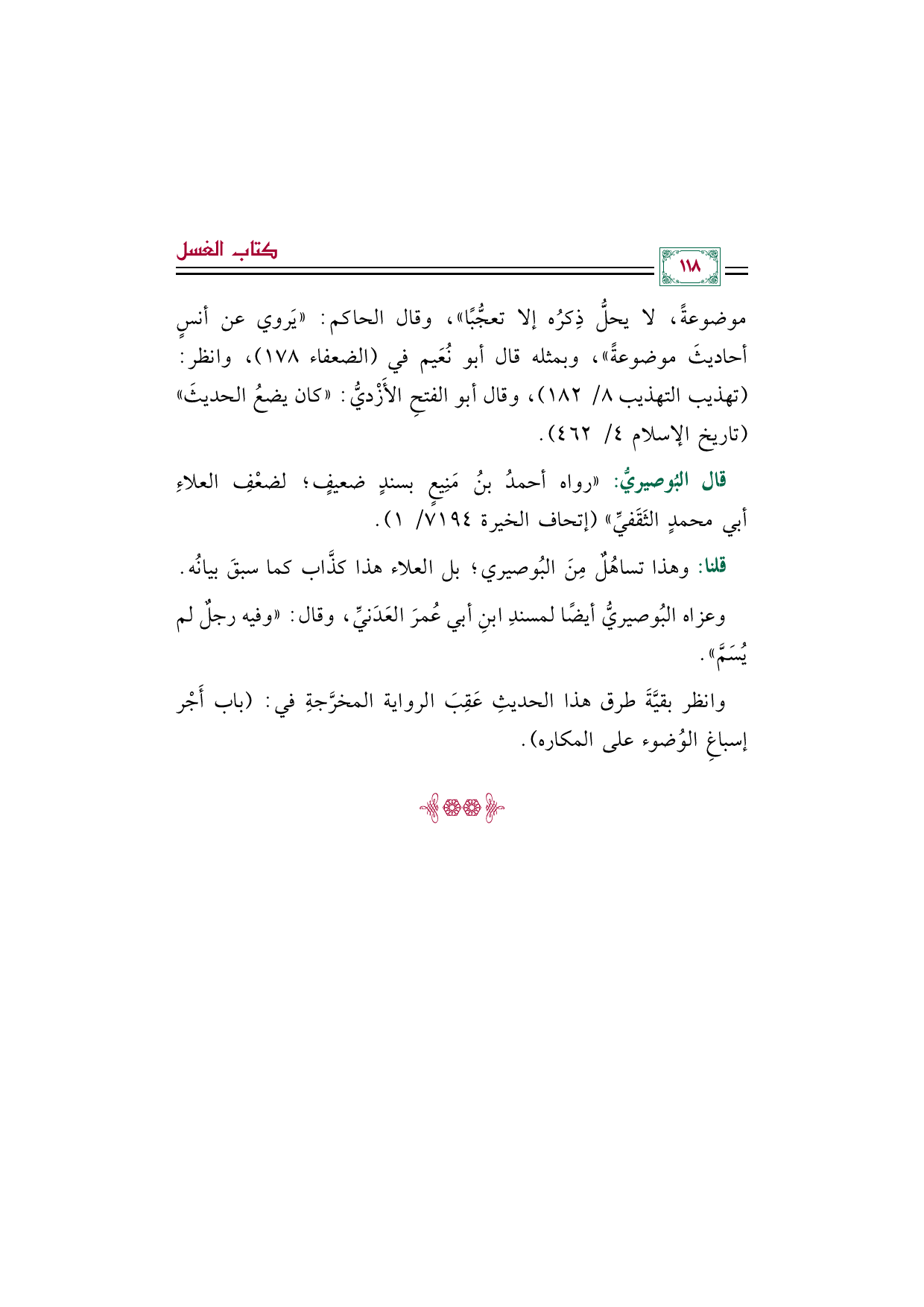 قلنا: وهذا تساهُلٌ مِنَ البُوصيري؛ بل العلاء هذا كذَّاب كما سبقَ بيانُه.