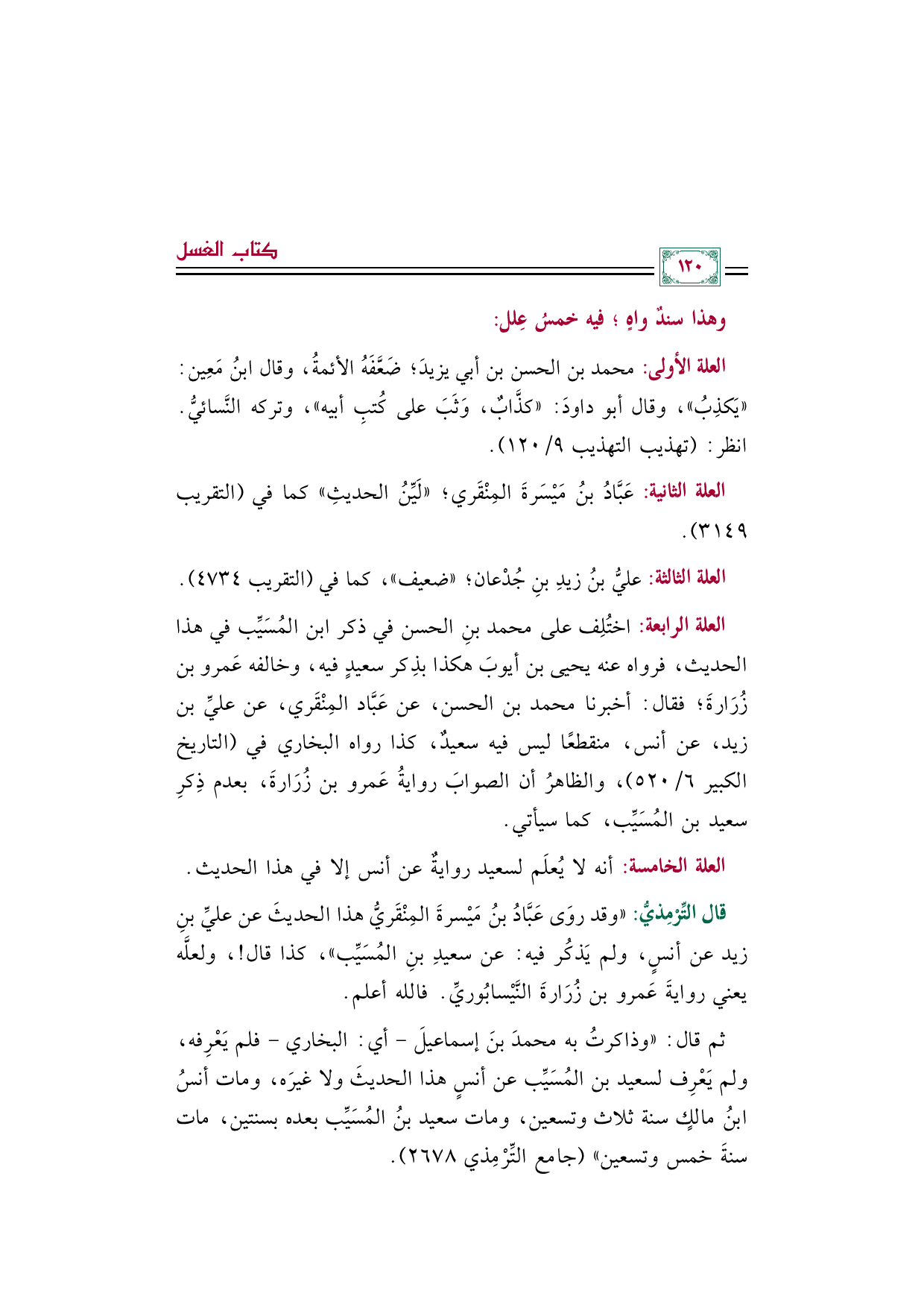 العلة الرابعة: اختُلِف على محمد بنِ الحسن في ذكر ابن المُسَيِّب في هذا الحديث، فرواه عنه يحيى بن أيوبَ هكذا بذِكر سعيدٍ فيه، وخالفه عَمرو بن زُرَارةَ؛ فقال: أخبرنا محمد بن الحسن، عن عَبَّاد المِنْقَري، عن عليِّ بن زيد، عن أنس، منقطعًا ليس فيه سعيدٌ، كذا رواه البخاري في (التاريخ الكبير ٦/ ٥٢٠)، والظاهرُ أن الصوابَ روايةُ عَمرو بن زُرَارةَ، بعدم ذِكرِ سعيد بن المُسَيِّب، كما سيأتي.
