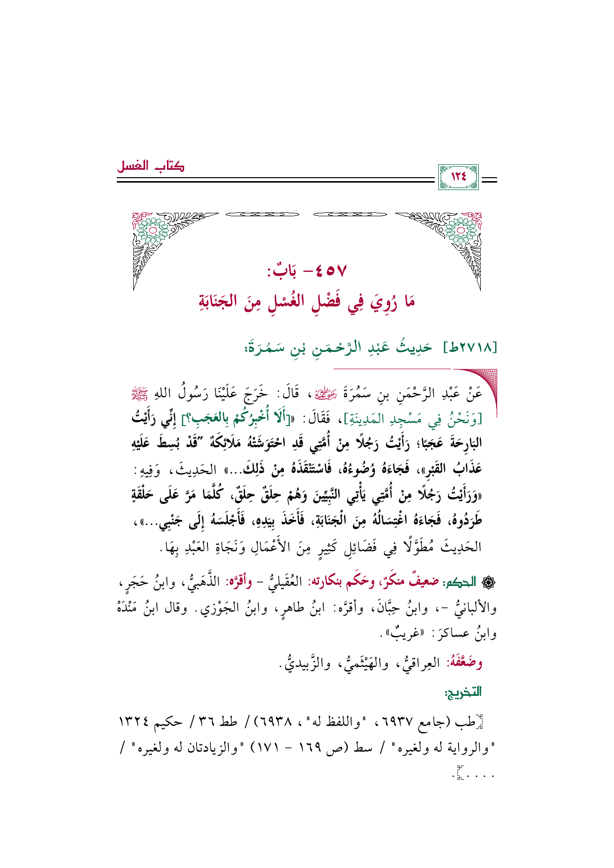 ◼ عَنْ عَبْدِ الرَّحْمَنِ بنِ سَمُرَةَ رضي الله عنه، قَالَ: خَرَجَ عَلَيْنَا رَسُولُ اللهِ صلى الله عليه وسلم [وَنَحْنُ فِي مَسْجِدِ المَدِينَةِ]، فَقَالَ: (([أَلَا أُخْبِرُكُمْ بِالعَجَبِ؟ ] إِنِّي رَأَيْتُ البَارِحَةَ عَجَبًا؛ رَأَيْتُ رَجُلًا مِنْ أُمَّتِي قَدِ احْتَوَشَتْهُ مَلَائِكَهٌ (قَدْ بُسِطَ عَلَيْهِ عَذَابُ القَبْرِ)، فَجَاءَهُ وُضُوءُهُ، فَاسْتَنْقَذَهُ مِنْ ذَلِكَ ... )) الحَدِيثَ، وَفِيهِ: ((وَرَأَيْتُ رَجُلًا مِنْ أُمَّتِي يَأْتِي النَّبِيِّينَ وَهُمْ حِلَقٌ حِلَقٌ، كُلَّمَا مَرَّ عَلَى حَلْقَةٍ طَرَدُوهُ، فَجَاءَهُ اغْتِسَالُهُ مِنَ الْجَنَابَةِ، فَأَخَذَ بِيَدِهِ، فَأَجْلَسَهُ إِلَى جَنْبِي ... ))، الحَدِيثَ مُطَوَّلًا فِي فَضَائِلِ كَثِيرٍ مِنَ الأَعْمَالِ وَنَجَاةِ العَبْدِ بِهَا.