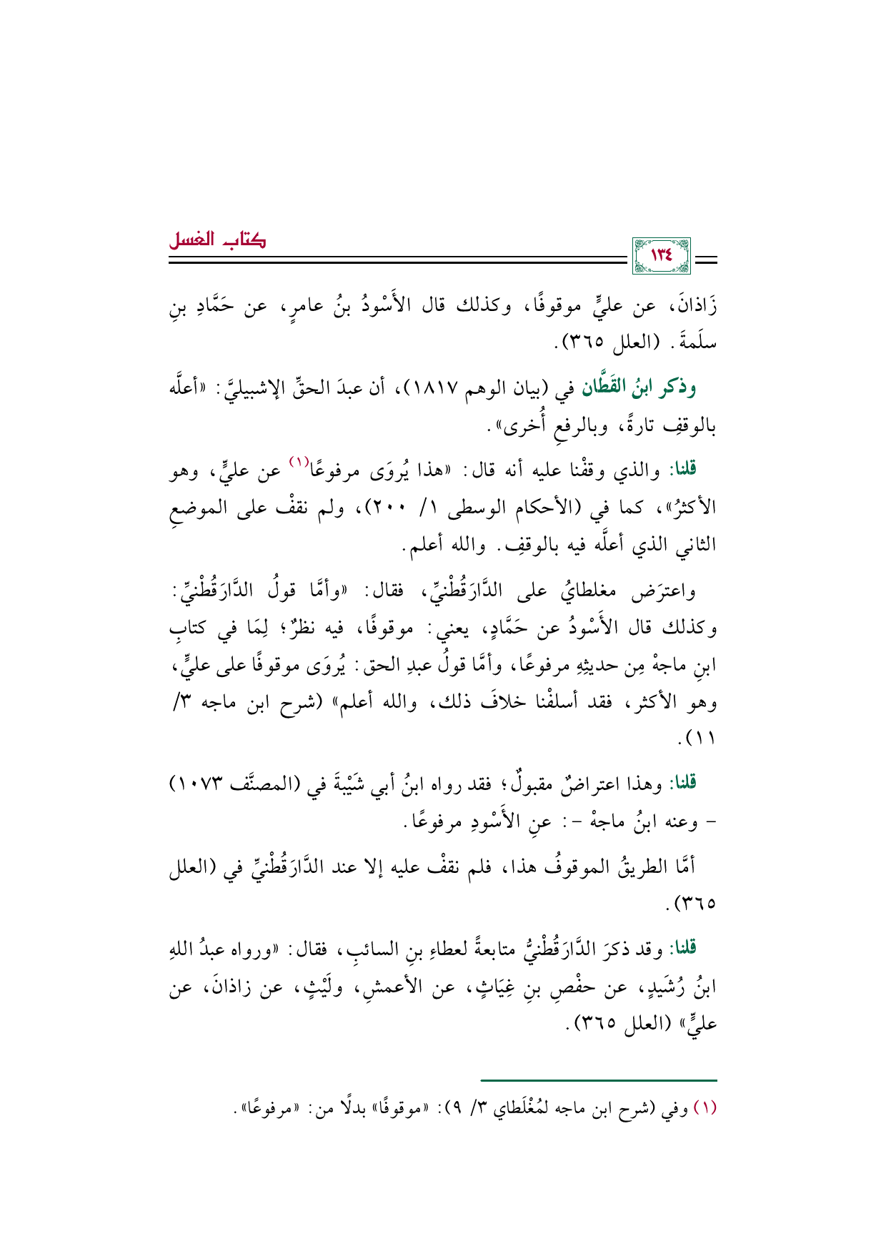 واعترَض مغلطايُ على الدَّارَقُطْنيِّ، فقال: "وأمَّا قولُ الدَّارَقُطْنيِّ: وكذلك قال الأَسْودُ عن حَمَّادٍ، يعني: موقوفًا، فيه نظرٌ؛ لِمَا في كتابِ ابنِ ماجهْ مِن حديثِهِ مرفوعًا، وأمَّا قولُ عبدِ الحق: يُروَى موقوفًا على عليٍّ، وهو الأكثر، فقد أسلفْنا خلافَ ذلك، والله أعلم" (شرح ابن ماجه ٣/ ١١).