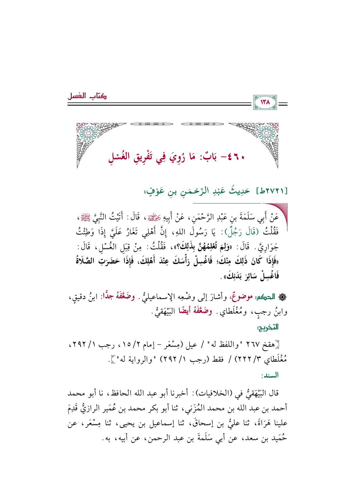 قال البَيْهَقيُّ في (الخلافيات): أخبرنا أبو عبد الله الحافظ، نا أبو محمد أحمد بن عبد الله بن محمد المُزَني، ثنا أبو بكر محمد بن عُمَير الرازيُّ قَدِمَ علينا هَرَاةَ، ثنا عليُّ بن إسحاقَ، ثنا إسماعيل بن يحيى، ثنا مِسْعَر، عن حُمَيد بن سعد، عن أبي سَلَمةَ بن عبد الرحمن، عن أبيه، به.