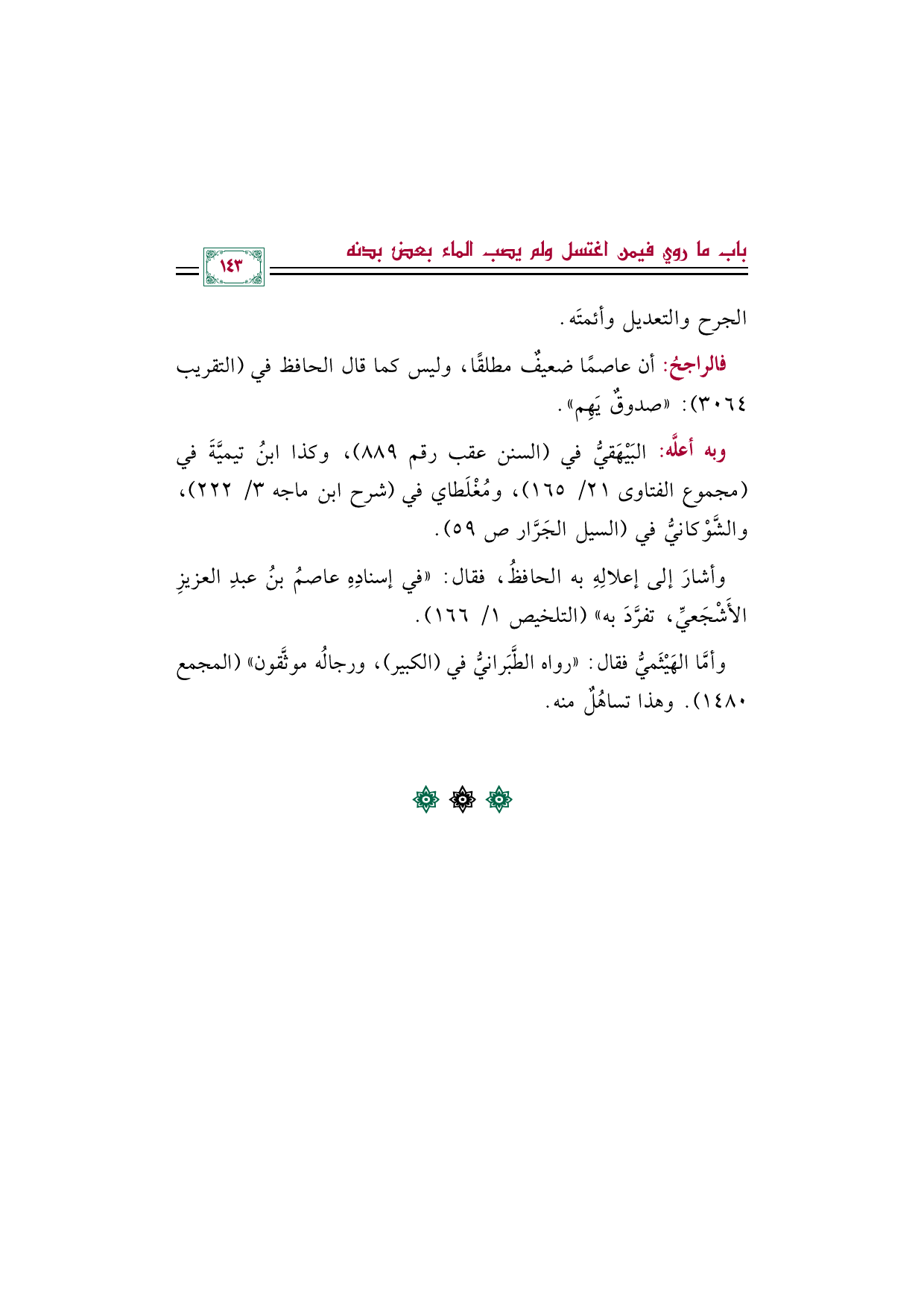 وأشارَ إلى إعلالِهِ به الحافظُ، فقال: "في إسنادِهِ عاصمُ بنُ عبدِ العزيزِ الأَشْجَعيِّ، تفرَّدَ به" (التلخيص ١/ ١٦٦).
