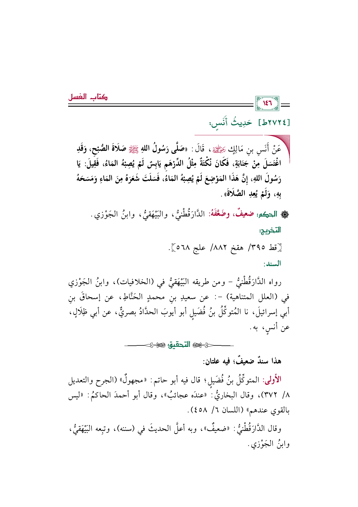 وقال الدَّارَقُطْنيُّ: "ضعيفٌ"، وبه أعلَّ الحديثَ في (سننه)، وتبِعه البَيْهَقيُّ، وابنُ الجَوْزي.