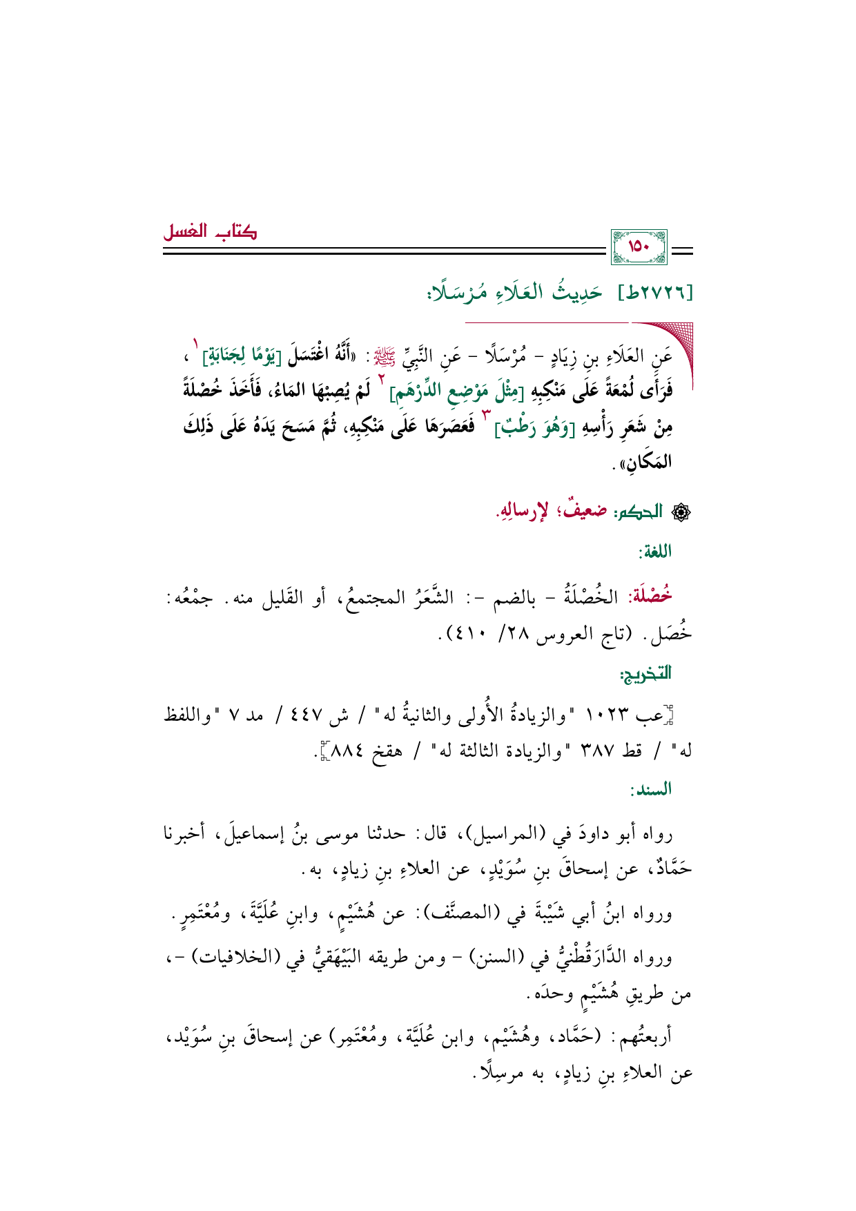 رواه أبو داودَ في (المراسيل)، قال: حدثنا موسى بنُ إسماعيلَ، أخبرنا حَمَّادٌ، عن إسحاقَ بنِ سُوَيْدٍ، عن العلاءِ بنِ زيادٍ، به.