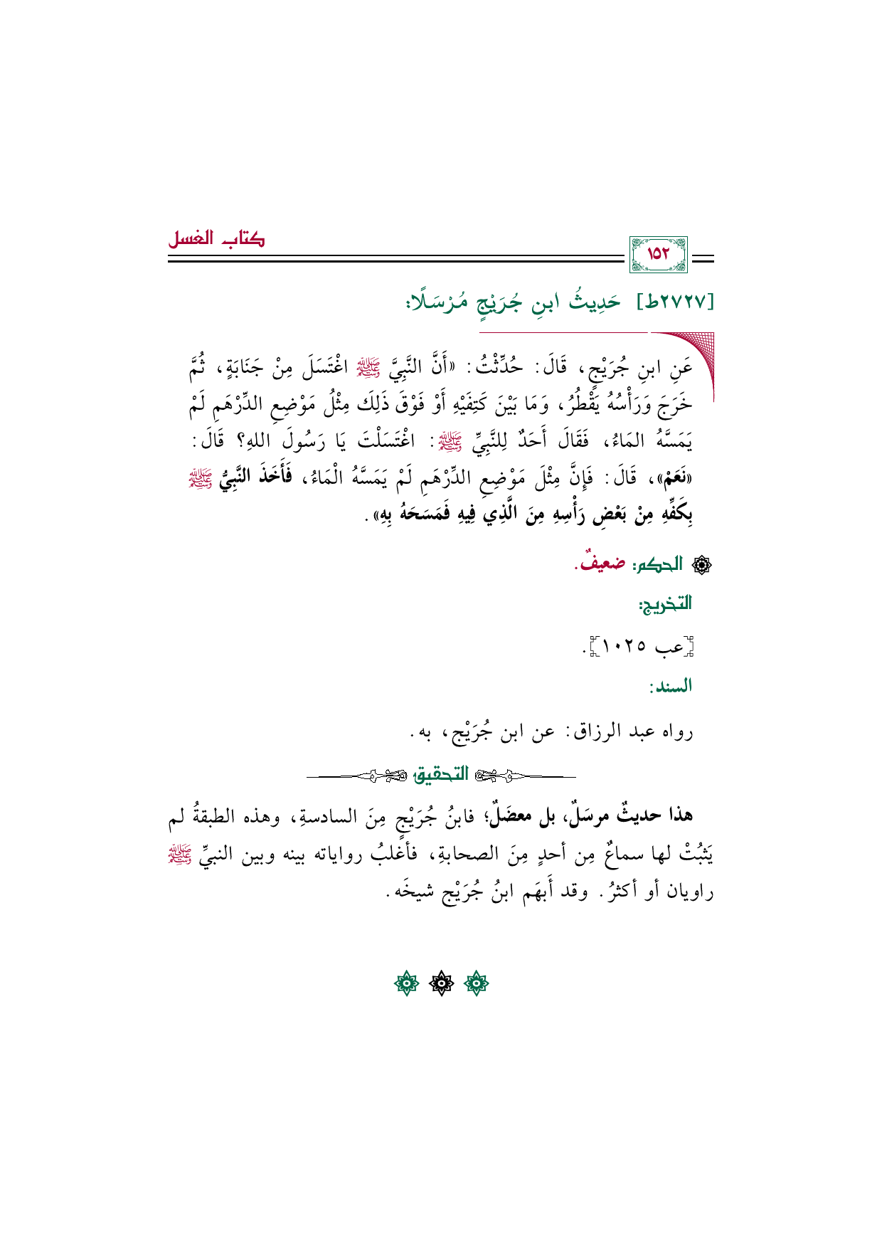 ◼ عَنِ ابنِ جُرَيْجٍ، قَالَ: حُدِّثْتُ: ((أَنَّ النَّبِيَّ صلى الله عليه وسلم اغْتَسَلَ مِنْ جَنَابَةٍ، ثُمَّ خَرَجَ وَرَأْسُهُ يَقْطُرُ، وَمَا بَيْنَ كَتِفَيْهِ أَوْ فَوْقَ ذَلِكَ مِثْلُ مَوْضِعِ الدِّرْهَمِ لَمْ يَمَسَّهُ المَاءُ، فَقَالَ أَحَدٌ لِلنَّبِيِّ صلى الله عليه وسلم: اغْتَسَلْتَ يَا رَسُولَ اللهِ؟ قَالَ: ((نَعَمْ))، قَالَ: فَإِنَّ مِثْلَ مَوْضِعِ الدِّرْهَمِ لَمْ يَمَسَّهُ الْمَاءُ، فَأَخَذَ النَّبِيُّ صلى الله عليه وسلم بِكَفِّهِ مِنْ بَعْضِ رَأْسِهِ مِنَ الَّذِي فِيهِ فَمَسَحَهُ بِهِ)).