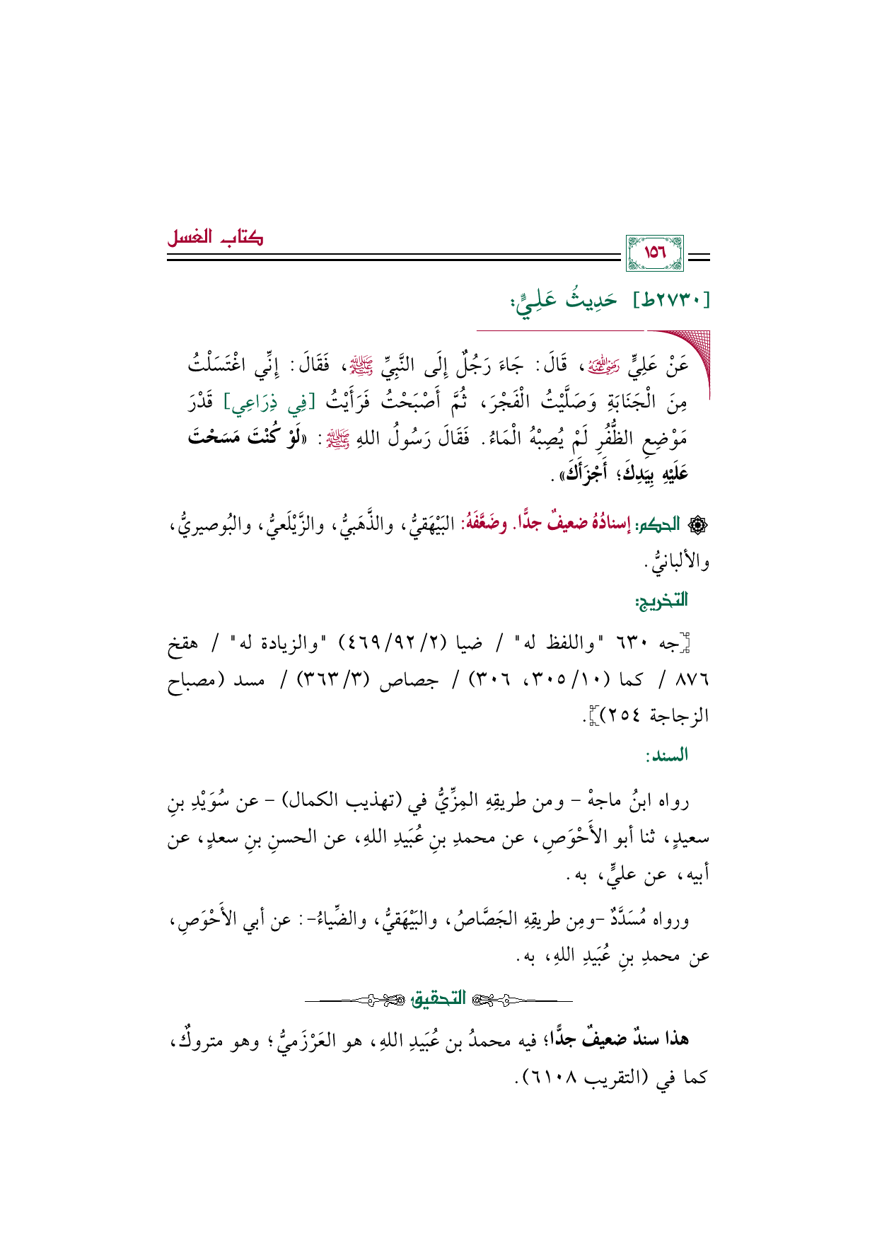 رواه ابنُ ماجهْ -ومن طريقِهِ المِزِّيُّ في (تهذيب الكمال) - عن سُوَيْدِ بنِ سعيدٍ، ثنا أبو الأَحْوَصِ، عن محمدِ بنِ عُبَيدِ اللهِ، عن الحسنِ بنِ سعدٍ، عن أبيه، عن عليٍّ، به.