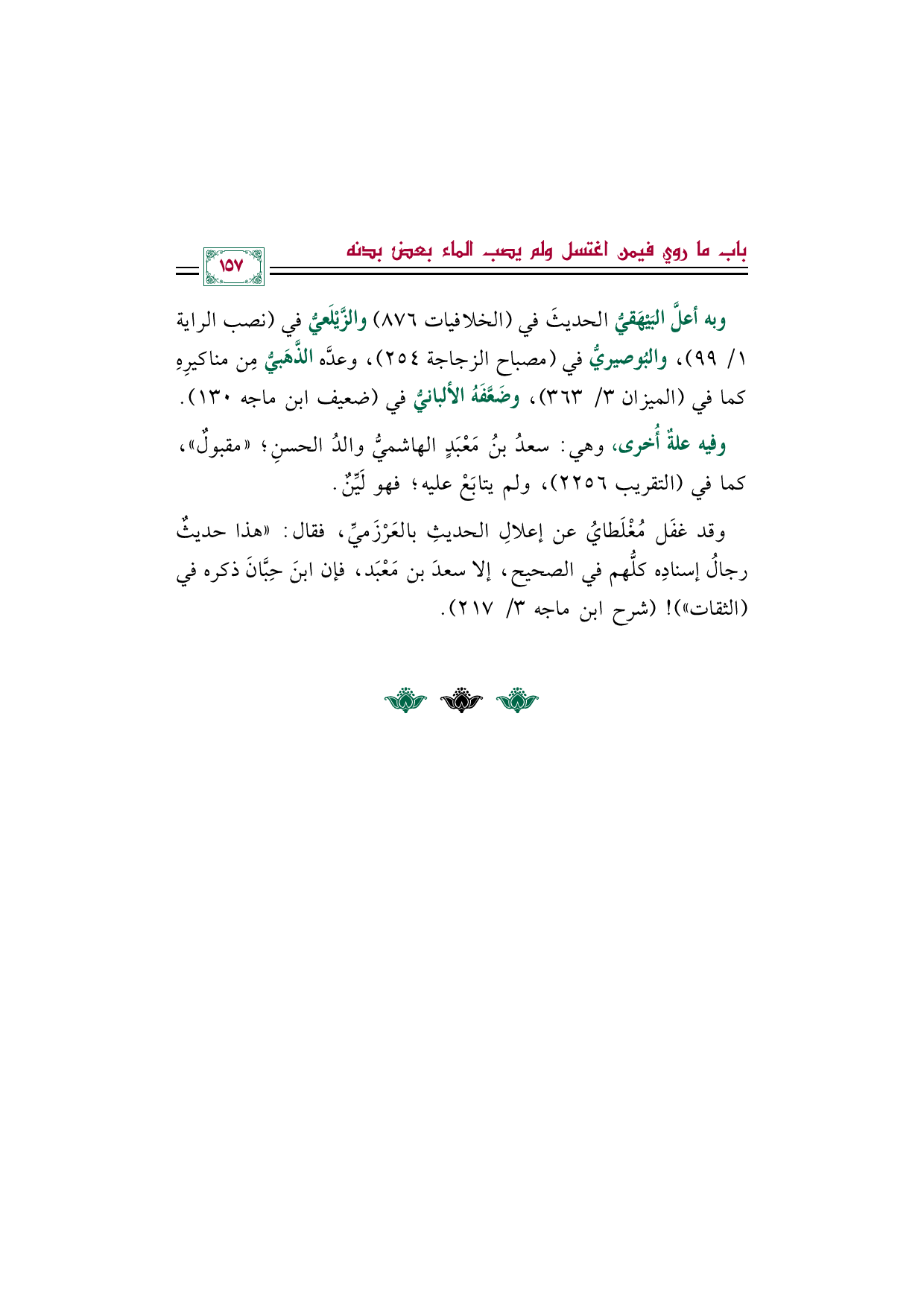وقد غفَل مُغْلَطايُ عن إعلالِ الحديثِ بالعَرْزَميِّ، فقال: "هذا حديثٌ رجالُ إسنادِه كلُّهم في الصحيح، إلا سعدَ بن مَعْبَد، فإن ابنَ حِبَّانَ ذكره في (الثقات) "! (شرح ابن ماجه ٣/ ٢١٧).