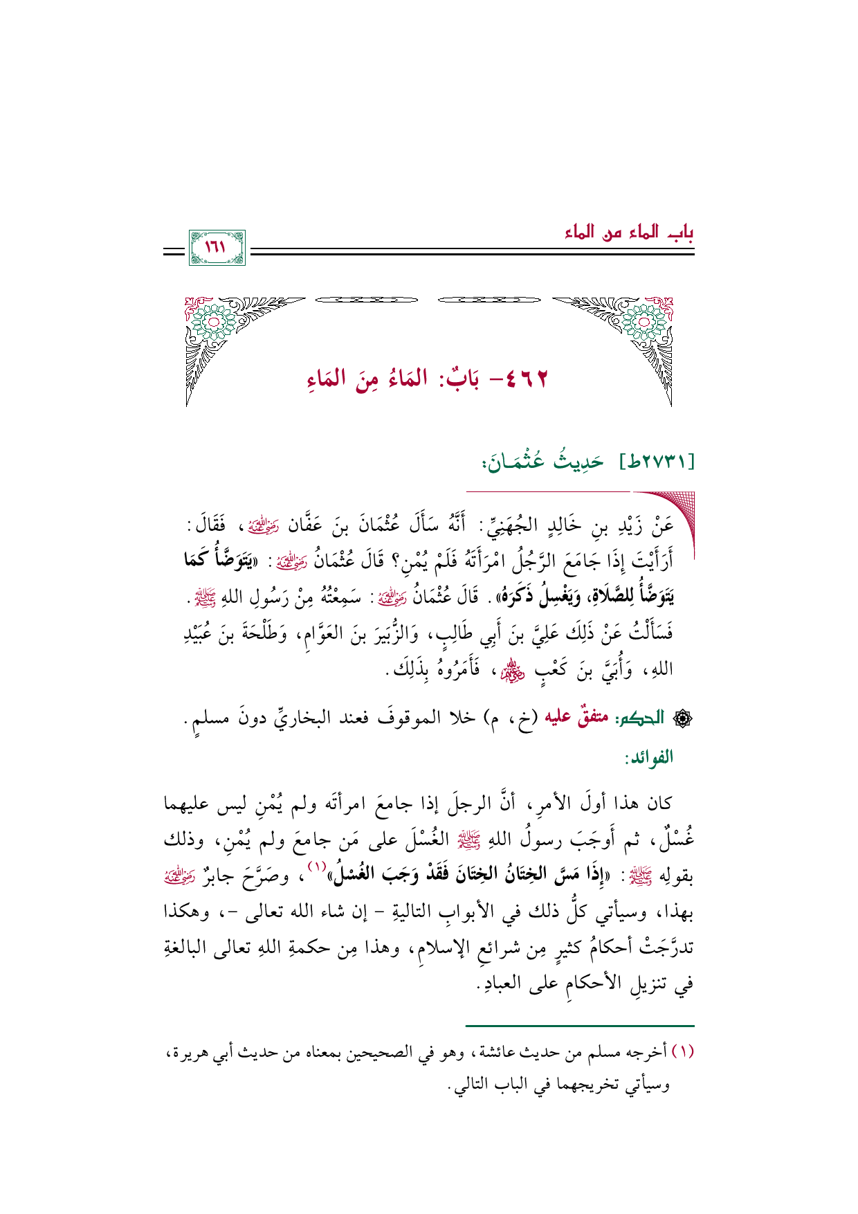 كان هذا أولَ الأمرِ، أنَّ الرجلَ إذا جامعَ امرأتَه ولم يُمْنِ ليس عليهما غُسْلٌ، ثم أَوجَبَ رسولُ اللهِ صلى الله عليه وسلم الغُسْلَ على مَن جامعَ ولم يُمْنِ، وذلك بقولِه صلى الله عليه وسلم: ((إِذَا مَسَّ الخِتَانُ الخِتَانَ فَقَدْ وَجَبَ الغُسْلُ)) (¬١)، وصَرَّحَ جابرٌ رضي الله عنه بهذا، وسيأتي كلُّ ذلك في الأبوابِ التاليةِ -إن شاء الله تعالى-، وهكذا تدرَّجَتْ أحكامُ كثيرٍ مِن شرائعِ الإسلامِ، وهذا مِن حكمةِ اللهِ تعالى البالغةِ في تنزيلِ الأحكامِ على العبادِ.