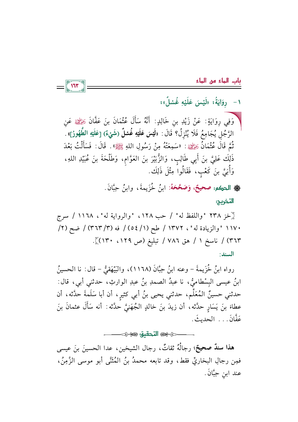 رواه ابنُ خُزَيمةَ -وعنه ابنُ حِبَّانَ (١١٦٨)، والبَيْهَقيُّ- قال: نا الحسينُ بنُ عيسى البِسْطاميُّ، نا عبدُ الصمدِ بنُ عبدِ الوارثِ، حدثني أبي، قال: حدثني حسينٌ المُعَلِّم، حدثني يحيى بنُ أبي كثيرٍ، أن أبا سَلَمةَ حدَّثه، أن عطاءَ بنَ يَسَارٍ حدَّثه، أن زيدَ بنَ خالدٍ الجُهَنيَّ حدَّثه: أنه سَأَلَ عثمانَ بنَ عَفَّانَ .... الحديثَ.