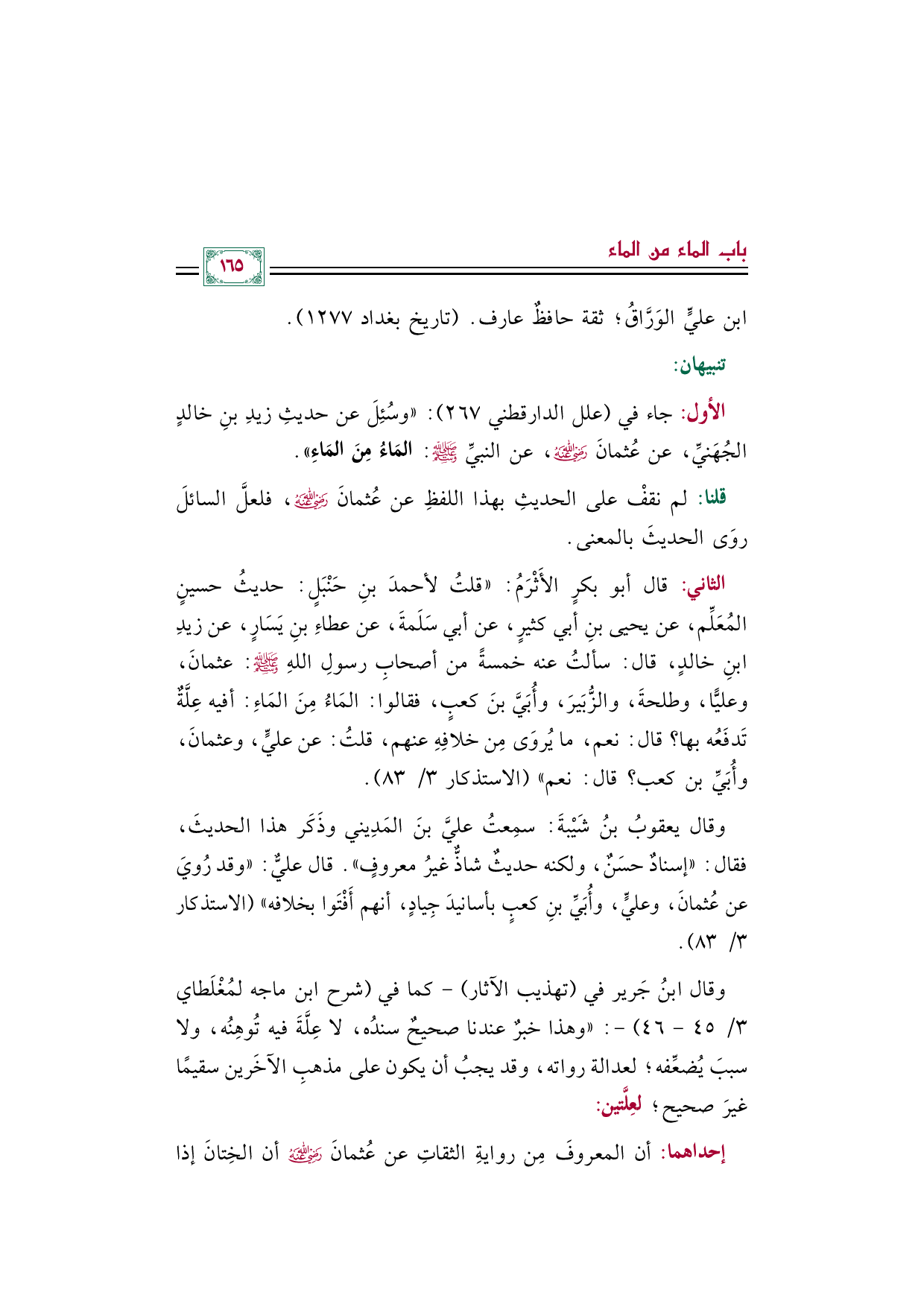 الأول: جاء في (علل الدارقطني ٢٦٧): "وسُئِلَ عن حديثِ زيدِ بنِ خالدٍ الجُهَنيِّ، عن عُثمانَ رضي الله عنه، عن النبيِّ صلى الله عليه وسلم: المَاءُ مِنَ المَاءِ".