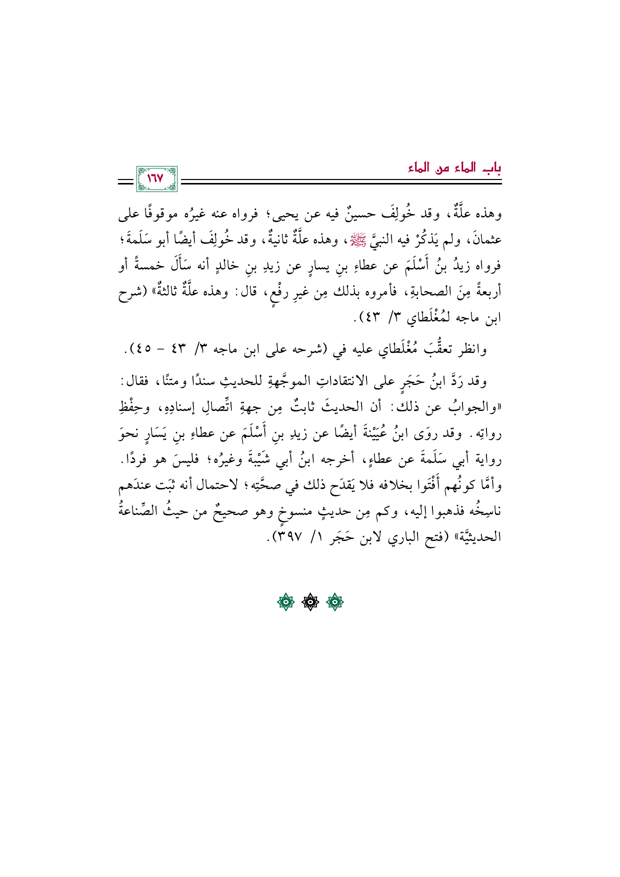 وهذه علَّةٌ، وقد خُولِفَ حسينٌ فيه عن يحيى؛ فرواه عنه غيرُه موقوفًا على عثمانَ، ولم يَذكُرْ فيه النبيَّ صلى الله عليه وسلم، وهذه علَّةٌ ثانيةٌ، وقد خُولِفَ أيضًا أبو سَلَمةَ؛ فرواه زيدُ بنُ أَسْلَمَ عن عطاءِ بنِ يسارٍ عن زيدِ بنِ خالدٍ أنه سَأَلَ خمسةً أو أربعةً مِنَ الصحابةِ، فأمروه بذلك مِن غيرِ رفْعٍ، قال: وهذه علَّةٌ ثالثةٌ" (شرح ابن ماجه لمُغْلَطاي ٣/ ٤٣).