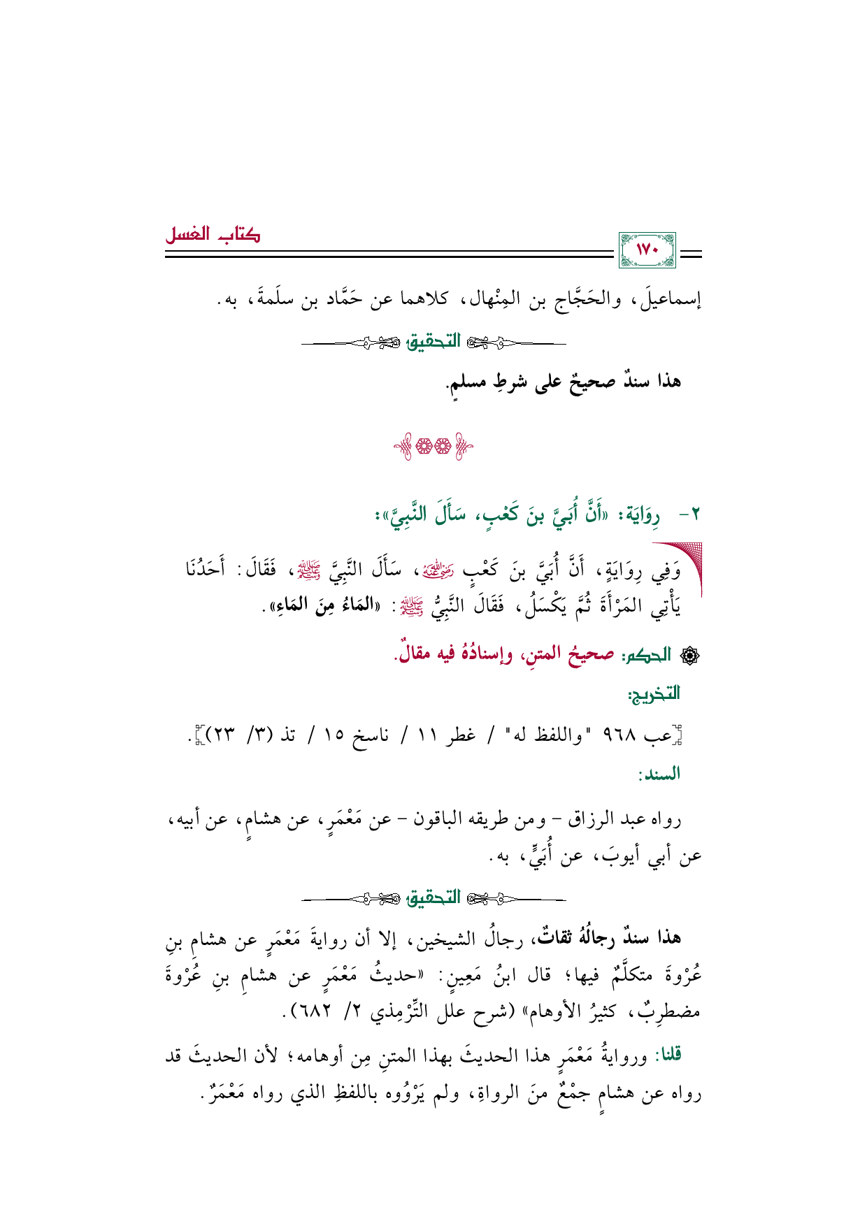رواه عبد الرزاق -ومن طريقه الباقون- عن مَعْمَرٍ، عن هشامٍ، عن أبيه، عن أبي أيوبَ، عن أُبَيٍّ، به.