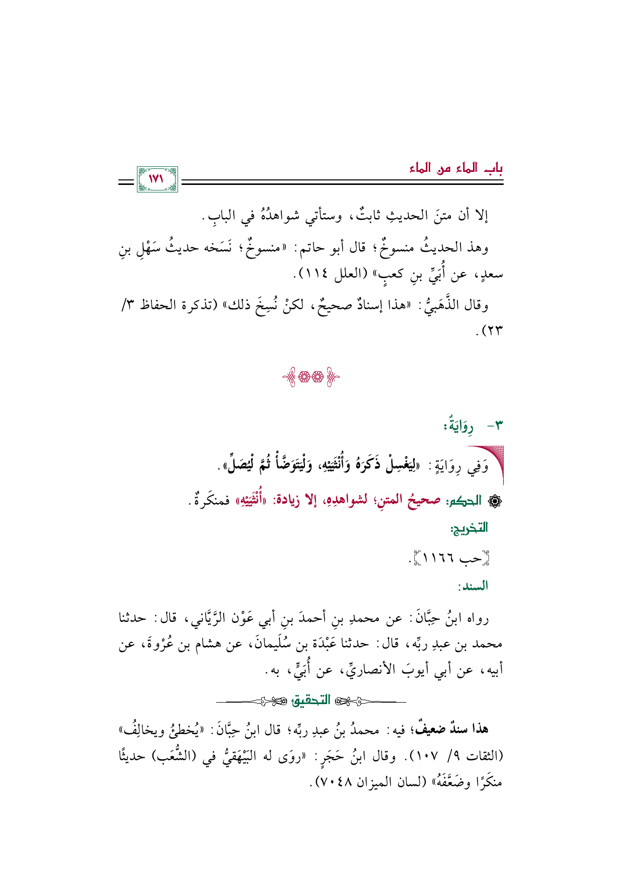 رواه ابنُ حِبَّانَ: عن محمدِ بنِ أحمدَ بنِ أبي عَوْن الرَّيَّاني، قال: حدثنا محمد بن عبدِ ربِّه، قال: حدثنا عَبْدَة بن سُلَيمانَ، عن هشام بن عُرْوةَ، عن أبيه، عن أبي أيوبَ الأنصاريِّ، عن أُبَيٍّ، به.