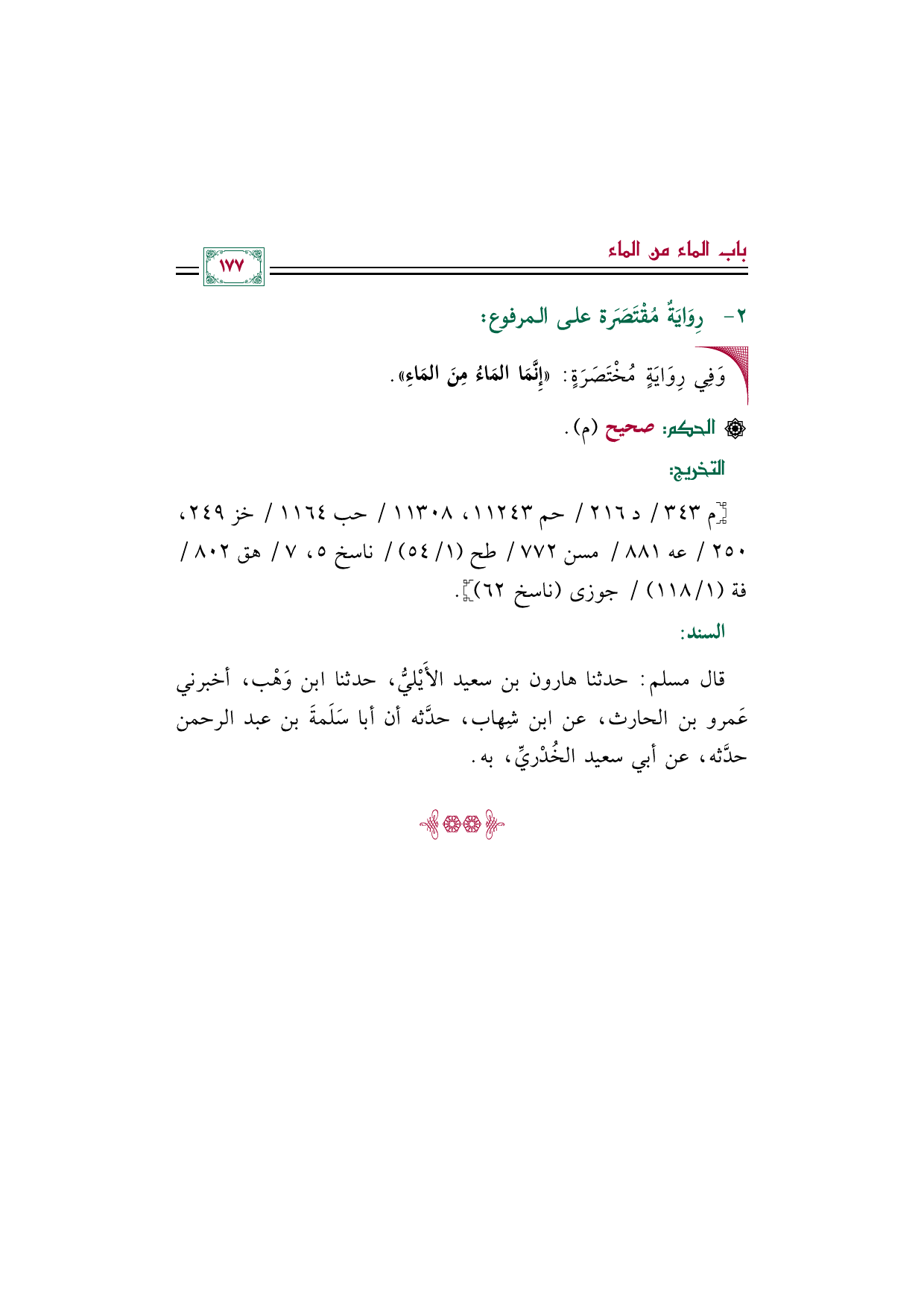 • وَفِي رِوَايَةٍ مُخْتَصَرَةٍ: ((إِنَّمَا المَاءُ مِنَ المَاءِ)).
