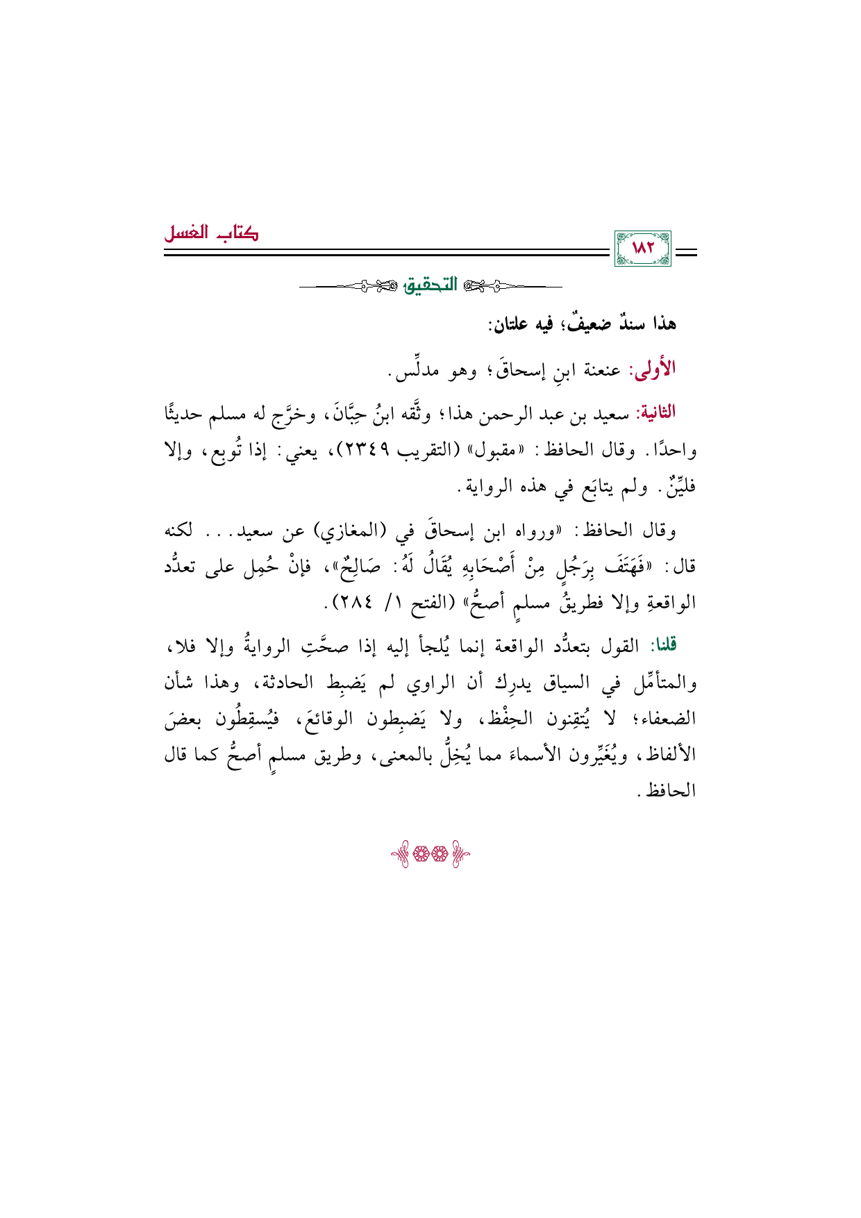 وقال الحافظ: "ورواه ابن إسحاقَ في (المغازي) عن سعيد ... لكنه قال: ((فَهَتَفَ بِرَجُلٍ مِنْ أَصْحَابِهِ يُقَالُ لَهُ: صَالِحٌ))، فإنْ حُمِل على تعدُّد الواقعةِ وإلا فطريقُ مسلمٍ أصحُّ" (الفتح ١/ ٢٨٤).