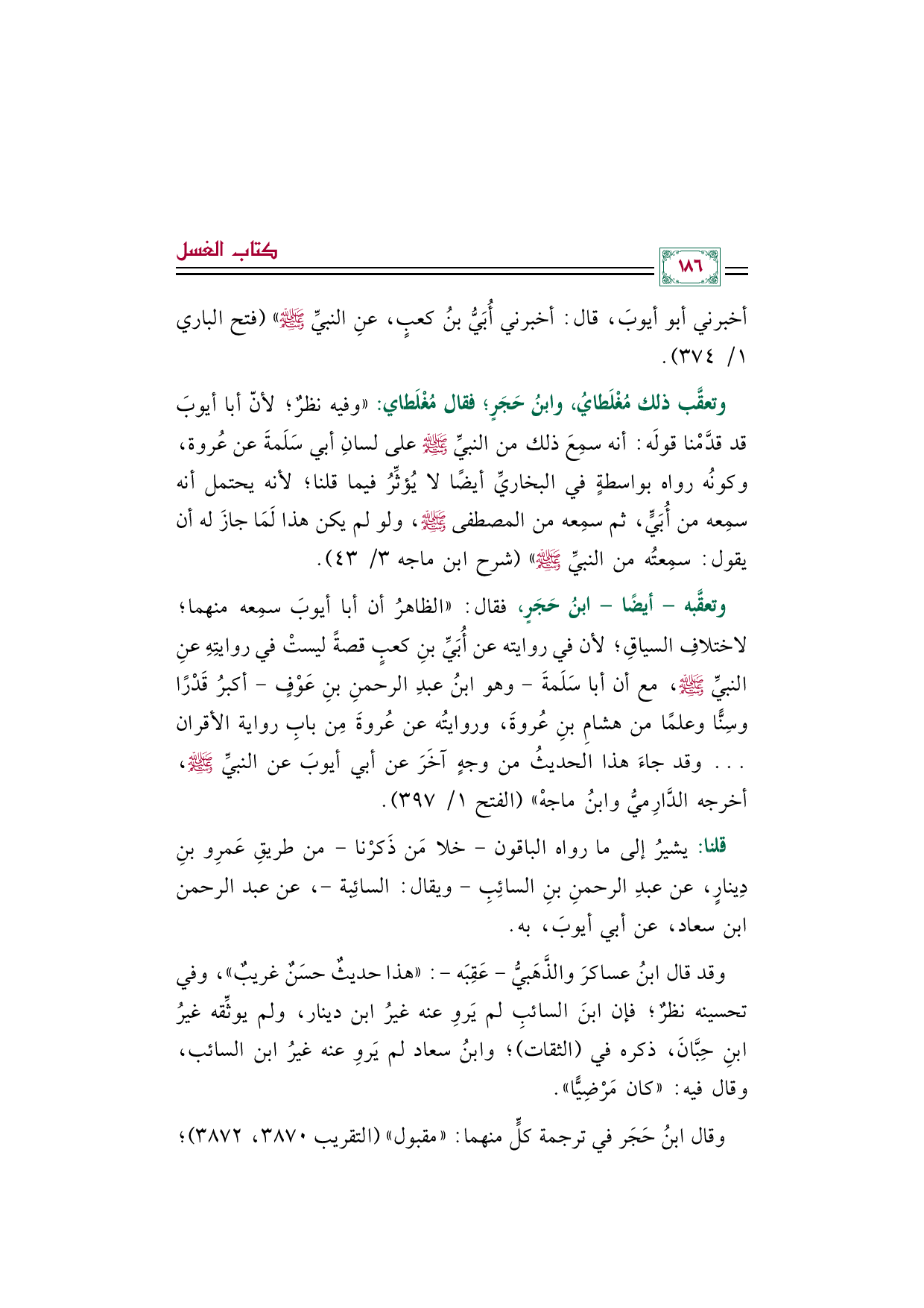 وتعقَّب ذلك مُغْلَطايُ، وابنُ حَجَرٍ؛ فقال مُغْلَطاي: "وفيه نظرٌ؛ لأنّ أبا أيوبَ قد قدَّمْنا قولَه: أنه سمِعَ ذلك من النبيِّ صلى الله عليه وسلم على لسانِ أبي سَلَمةَ عن عُروة، وكونُه رواه بواسطةٍ في البخاريِّ أيضًا لا يُؤثِّرُ فيما قلنا؛ لأنه يحتمل أنه سمِعه من أُبَيٍّ، ثم سمِعه من المصطفى صلى الله عليه وسلم، ولو لم يكن هذا لَمَا جازَ له أن يقول: سمِعتُه من النبيِّ صلى الله عليه وسلم" (شرح ابن ماجه ٣/ ٤٣).
