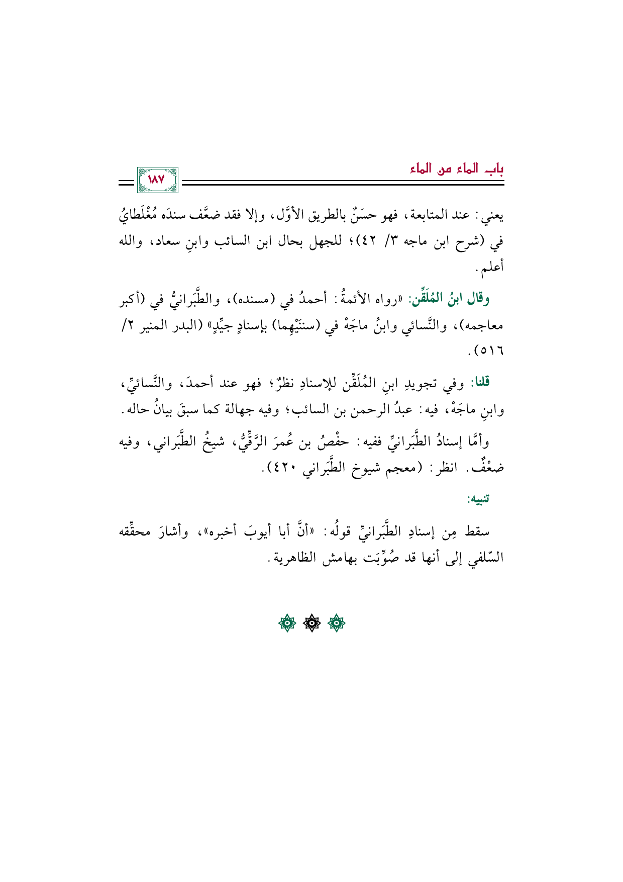 قلنا: وفي تجويدِ ابنِ المُلَقِّن للإسنادِ نظرٌ؛ فهو عند أحمدَ، والنَّسائيِّ، وابنِ ماجَهْ، فيه: عبدُ الرحمن بن السائب؛ وفيه جهالة كما سبقَ بيانُ حاله.