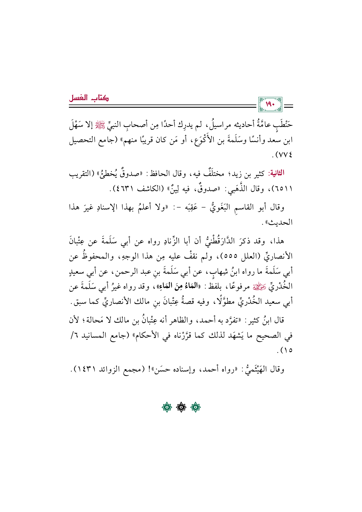 هذا، وقد ذكرَ الدَّارَقُطْنيُّ أن أبا الزِّنادِ رواه عن أبي سَلَمةَ عن عِتْبانَ الأنصاريِّ (العلل ٥٥٥)، ولم نقفْ عليه مِن هذا الوجهِ، والمحفوظُ عن أبي سَلَمةَ ما رواه ابنُ شِهابٍ، عن أبي سَلَمةَ بنِ عبد الرحمن، عن أبي سعيدٍ الخُدْريِّ رضي الله عنه مرفوعًا، بلفظ: ((المَاءُ مِنَ المَاءِ))، وقد رواه غيرُ أبي سَلَمةَ عن أبي سعيد الخُدْريِّ مطوَّلًا، وفيه قصةُ عِتْبانَ بنِ مالك الأنصاريِّ كما سبق.