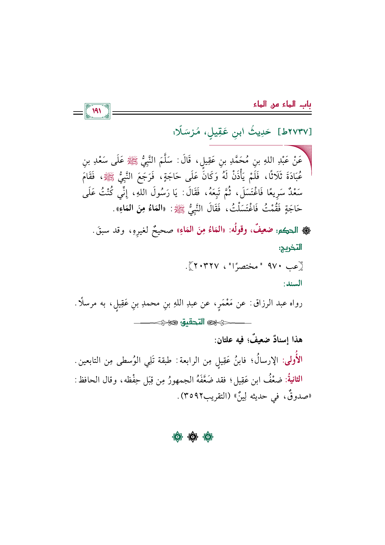 ◼ عَنْ عَبْدِ اللهِ بنِ مُحَمَّدِ بنِ عَقِيلٍ، قَالَ: سَلَّمَ النَّبِيُّ صلى الله عليه وسلم عَلَى سَعْدِ بنِ عُبَادَةَ ثَلَاثًا، فَلَمْ يَأْذَنْ لَهُ وَكَانَ عَلَى حَاجَةٍ، فَرَجَعَ النَّبِيُّ صلى الله عليه وسلم، فَقَامَ سَعْدٌ سَرِيعًا فَاغْتَسَلَ، ثُمَّ تَبِعَهُ، فَقَالَ: يَا رَسُولَ اللهِ، إِنِّي كُنْتُ عَلَى حَاجَةٍ فَقُمْتُ فَاغْتَسَلْتُ، فَقَالَ النَّبِيُّ صلى الله عليه وسلم: ((المَاءُ مِنَ المَاءِ)).