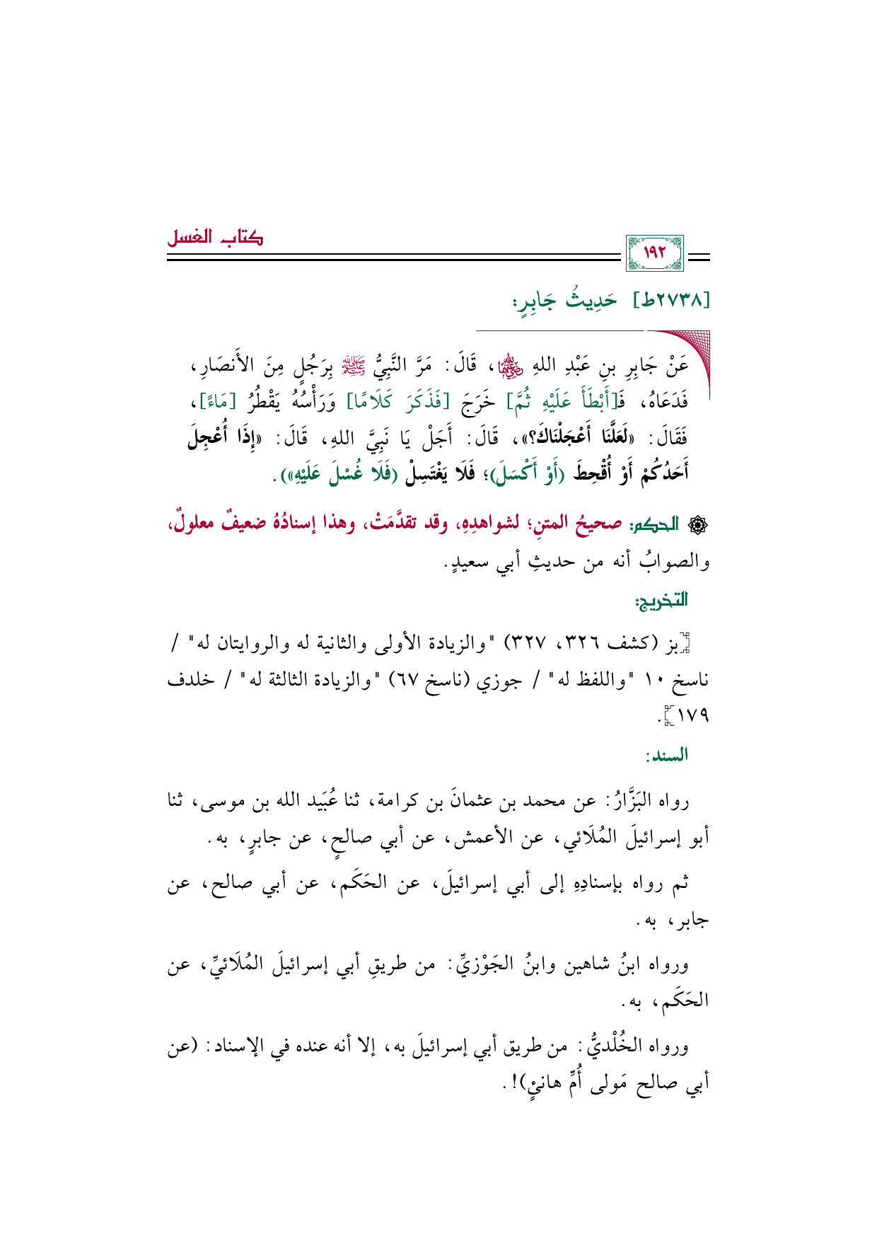 رواه البَزَّارُ: عن محمد بن عثمانَ بن كرامة، ثنا عُبَيد الله بن موسى، ثنا أبو إسرائيلَ المُلَائي، عن الأعمش، عن أبي صالحٍ، عن جابرٍ، به.