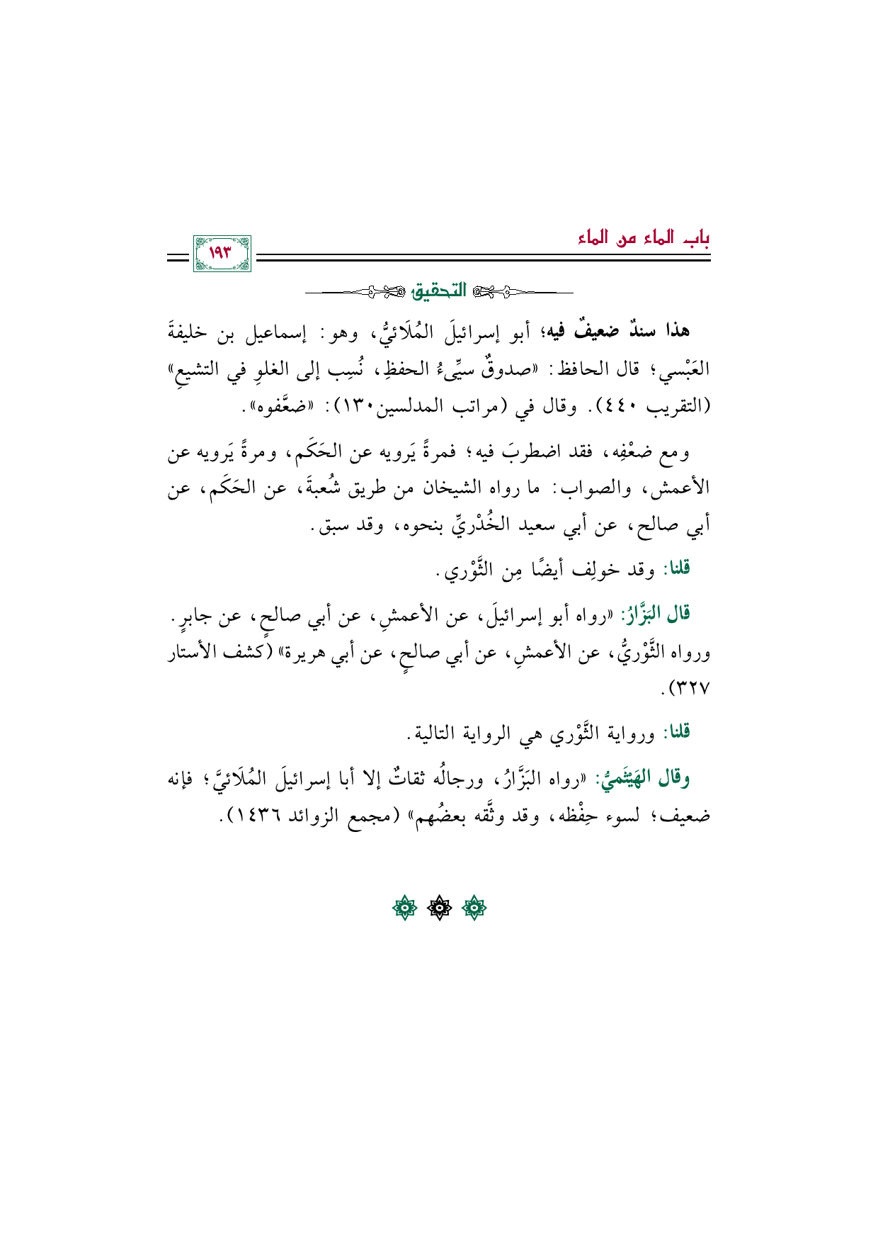 قال البَزَّارُ: "رواه أبو إسرائيلَ، عن الأعمشِ، عن أبي صالحٍ، عن جابرٍ. ورواه الثَّوْريُّ، عن الأعمشِ، عن أبي صالحٍ، عن أبي هريرة" (كشف الأستار ٣٢٧).