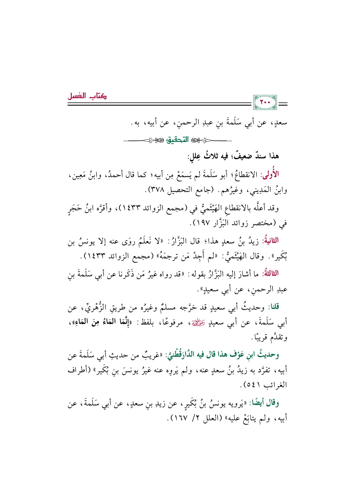 الأُولى: الانقطاعُ؛ أبو سَلَمةَ لم يَسمَعْ مِن أبيه؛ كما قال أحمدُ، وابنُ مَعِين، وابنُ المَدِيني، وغيرُهم. (جامع التحصيل ٣٧٨).