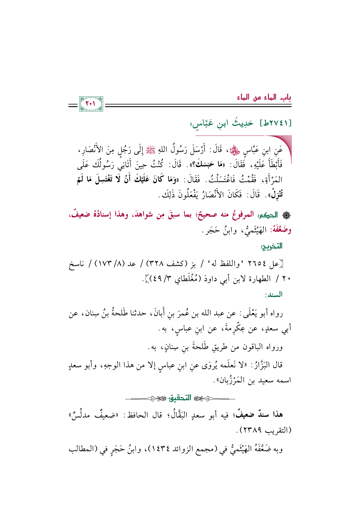 قال البَزَّارُ: "لا نَعلَمه يُروَى عنِ ابنِ عباسٍ إلا من هذا الوجهِ، وأبو سعدٍ اسمه سعيد بن المَرْزُبان".