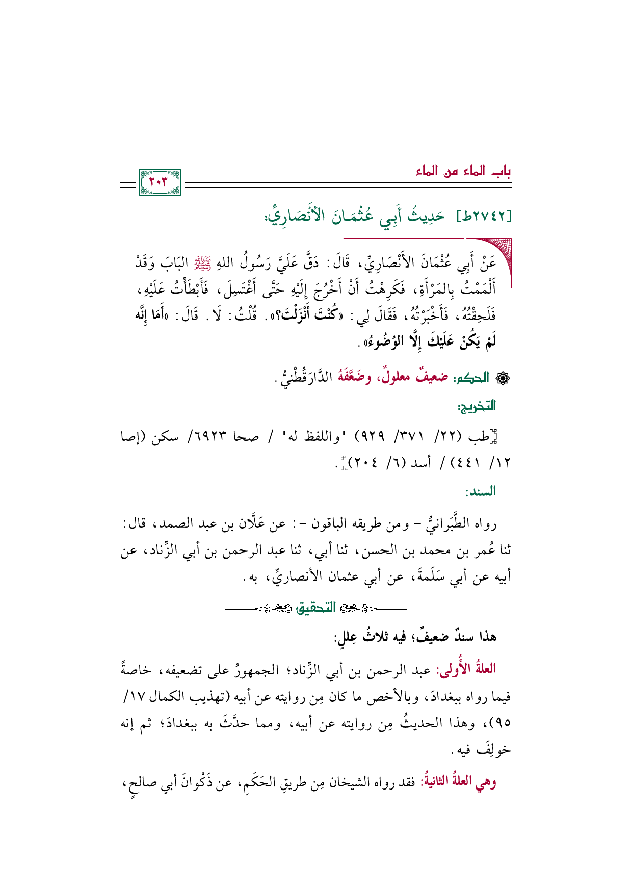 رواه الطَّبَرانيُّ -ومن طريقه الباقون-: عن عَلَّان بن عبد الصمد، قال: ثنا عُمر بن محمد بن الحسن، ثنا أبي، ثنا عبد الرحمن بن أبي الزِّناد، عن أبيه عن أبي سَلَمةَ، عن أبي عثمان الأنصاريِّ، به.
