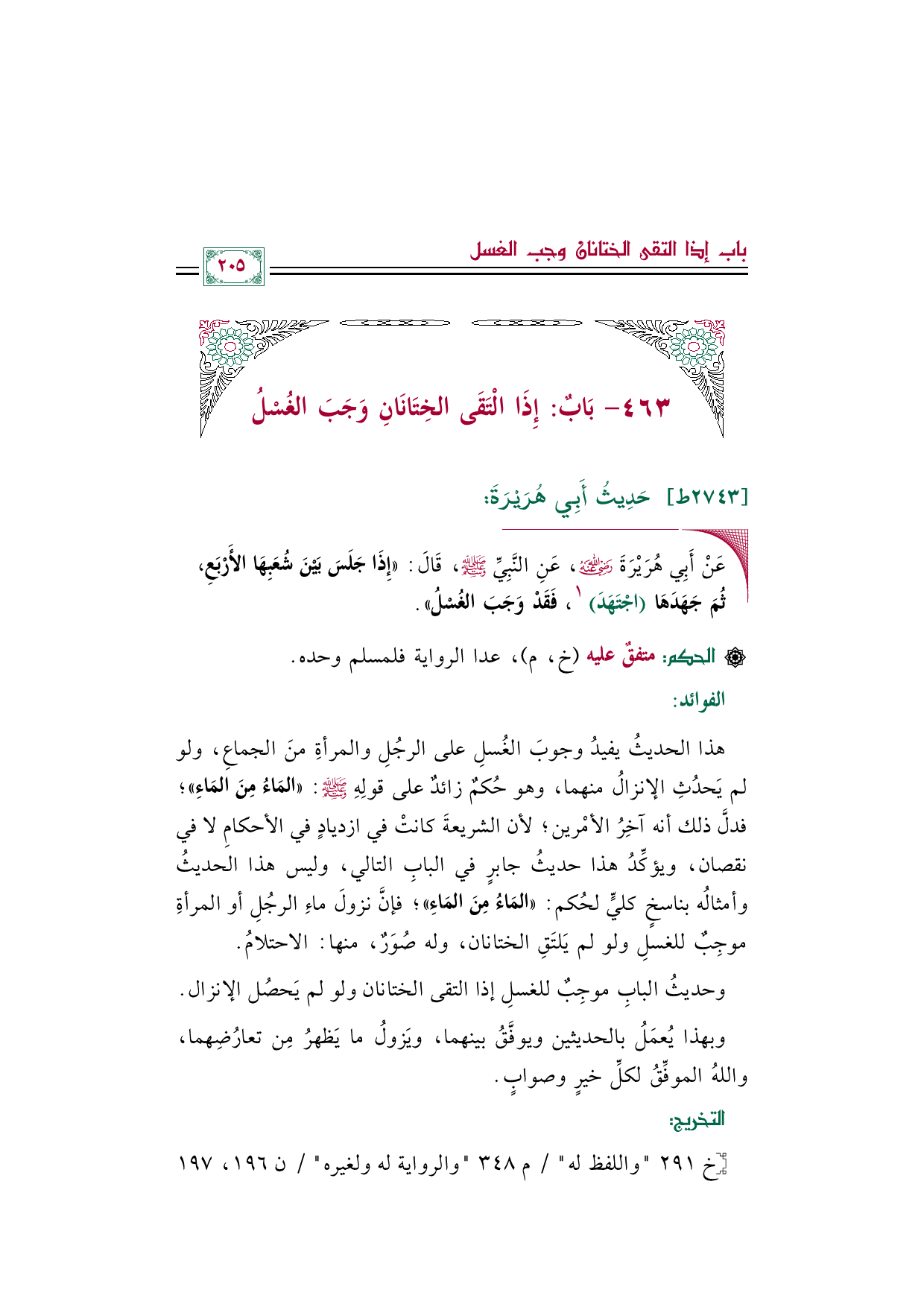 ◼ عَنْ أَبِي هُرَيْرَةَ رضي الله عنه، عَنِ النَّبِيِّ صلى الله عليه وسلم، قَالَ: ((إِذَا جَلَسَ بَيْنَ شُعَبِهَا الأَرْبَعِ، ثُمَ جَهَدَهَا (اجْتَهَدَ) ١، فَقَدْ وَجَبَ الغُسْلُ)).