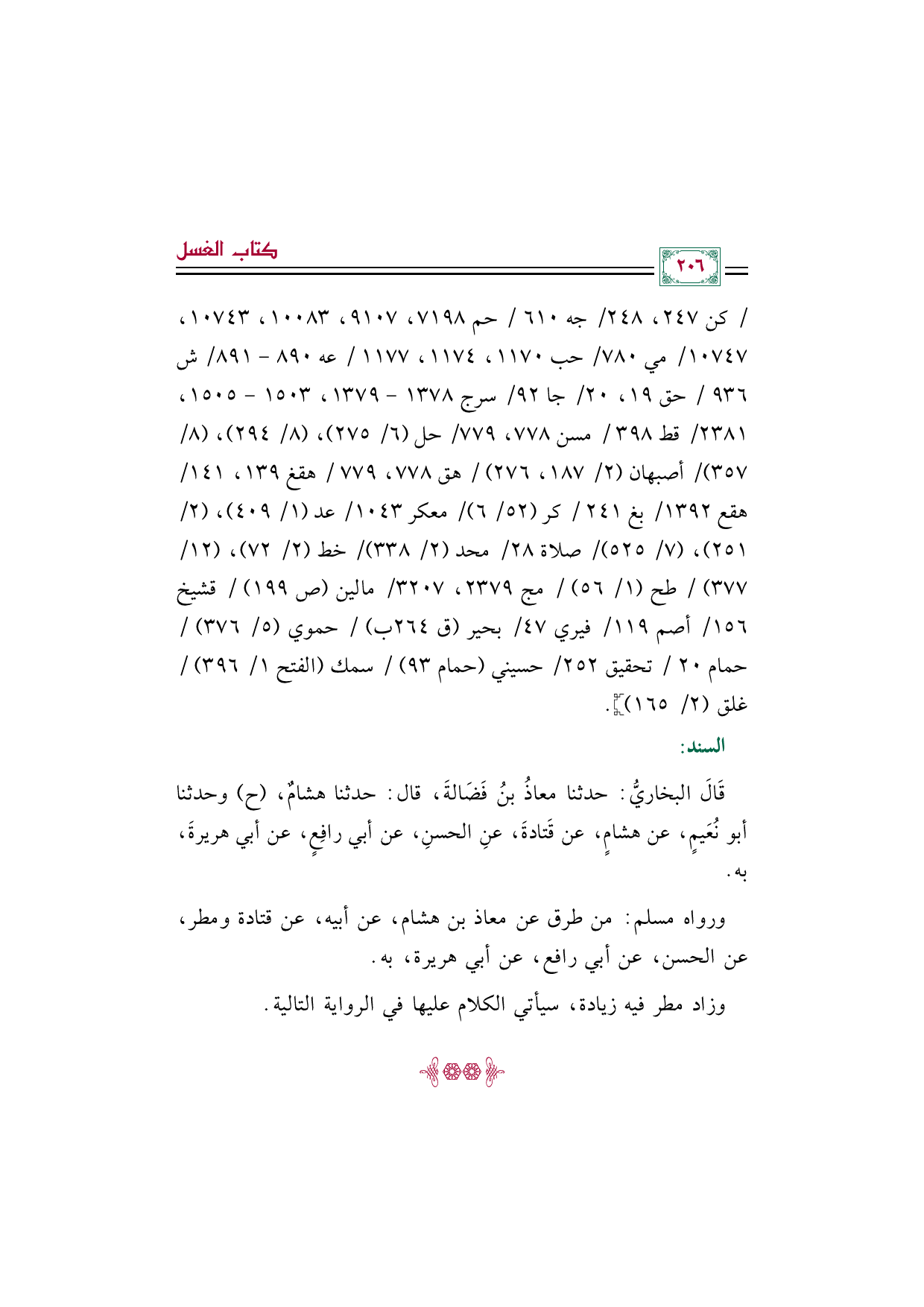 قَالَ البخاريُّ: حدثنا معاذُ بنُ فَضَالةَ، قال: حدثنا هشامٌ، (ح) وحدثنا أبو نُعَيمٍ، عن هشامٍ، عن قَتادةَ، عنِ الحسنِ، عن أبي رافِعٍ، عن أبي هريرةَ، به.