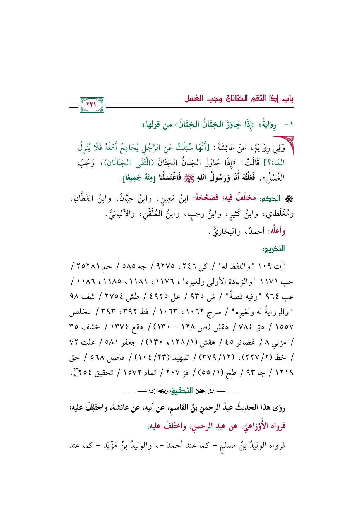 رِوَايَةُ ((إِذَا جَاوَزَ الخِتَانُ الخِتَانَ)) من قولها: