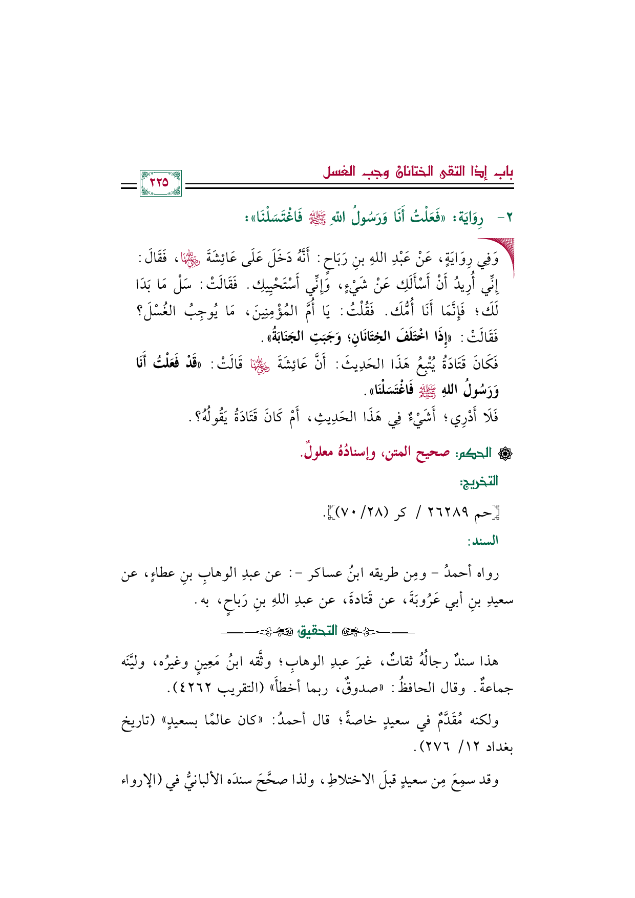• وَفِي رِوَايَةٍ، عَنْ عَبْدِ اللهِ بنِ رَبَاحٍ: أَنَّهُ دَخَلَ عَلَى عَائِشَةَ رضي الله عنها، فَقَالَ: إِنِّي أُرِيدُ أَنْ أَسْأَلَكِ عَنْ شَيْءٍ، وَإِنِّي أَسْتَحْيِيكِ. فَقَالَتْ: سَلْ مَا بَدَا لَكَ؛ فَإِنَّمَا أَنَا أُمُّكَ. فَقُلْتُ: يَا أُمَّ المُؤْمِنِينَ، مَا يُوجِبُ الغُسْلَ؟ فَقَالَتْ: ((إِذَا اخْتَلَفَ الخِتَانَانِ؛ وَجَبَتِ الجَنَابَةُ)).