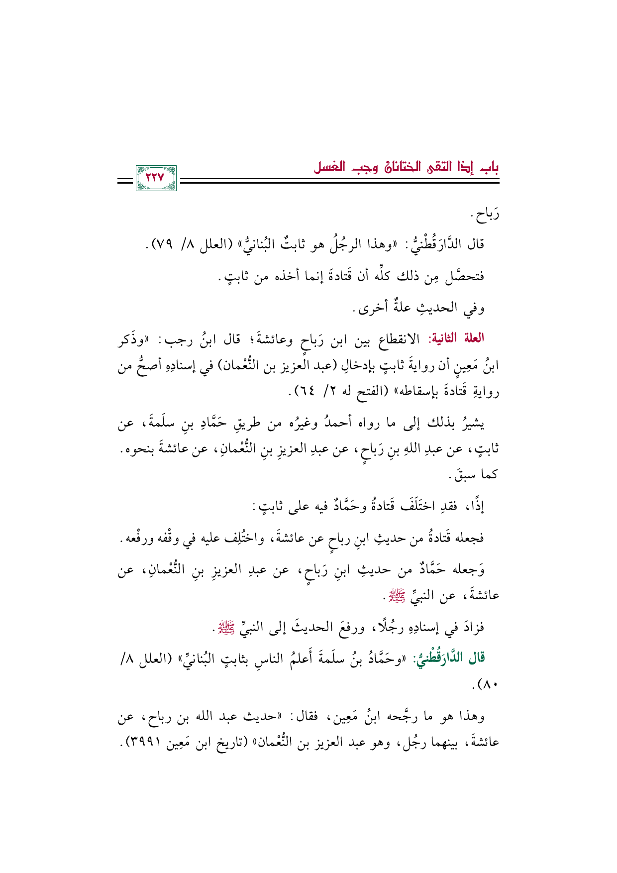 العلة الثانية: الانقطاع بين ابن رَباحٍ وعائشةَ؛ قال ابنُ رجب: "وذَكر ابنُ مَعِينٍ أن روايةَ ثابتٍ بإدخالِ (عبد العزيز بن النُّعْمان) في إسنادِهِ أصحُّ من روايةِ قَتادةَ بإسقاطه" (الفتح له ٢/ ٦٤).