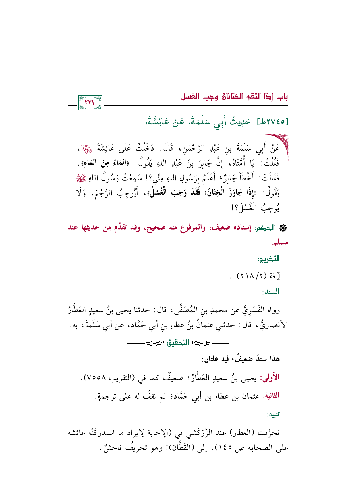 تحرَّفت (العطار) عند الزَّرْكَشي في (الإجابة لإيراد ما استدركَتْه عائشة على الصحابة ص ١٤٥)، إلى (القَطَّان)! وهو تحريفٌ فاحشٌ.