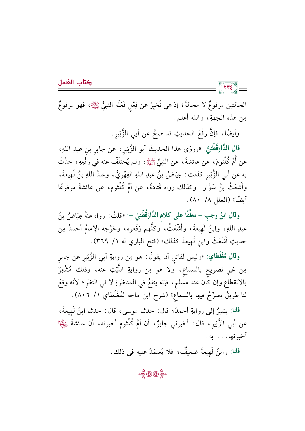 وقال مُغْلَطاي: "وليس لقائلٍ أن يقولَ: هو مِن روايةِ أبي الزُّبَيرِ عن جابرٍ مِن غيرِ تصريحٍ بالسماعِ، ولا هو مِن روايةِ اللَّيْثِ عنه، وذلك مُشْعِرٌ بالانقطاعِ وإن كان عند مسلمٍ، فإنه ينفعُ في المناظرةِ لا في النظرِ؛ لأنه وقعَ لنا طريقٌ يصرِّحُ فيها بالسماعِ" (شرح ابن ماجه لمُغْلَطاي ١/ ٨٠٦).