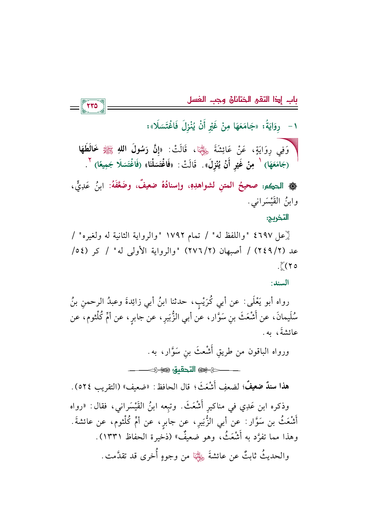وذكره ابن عَدِي في مناكيرِ أَشْعَثَ. وتبِعه ابنُ القَيْسَراني، فقال: "رواه أَشْعَثُ بن سَوَّار: عن أبي الزُّبَيرِ، عن جابرٍ، عن أمِّ كُلْثوم، عن عائشةَ. وهذا مما تفرَّد به أَشْعَثُ، وهو ضعيفٌ" (ذخيرة الحفاظ ١٣٣١).