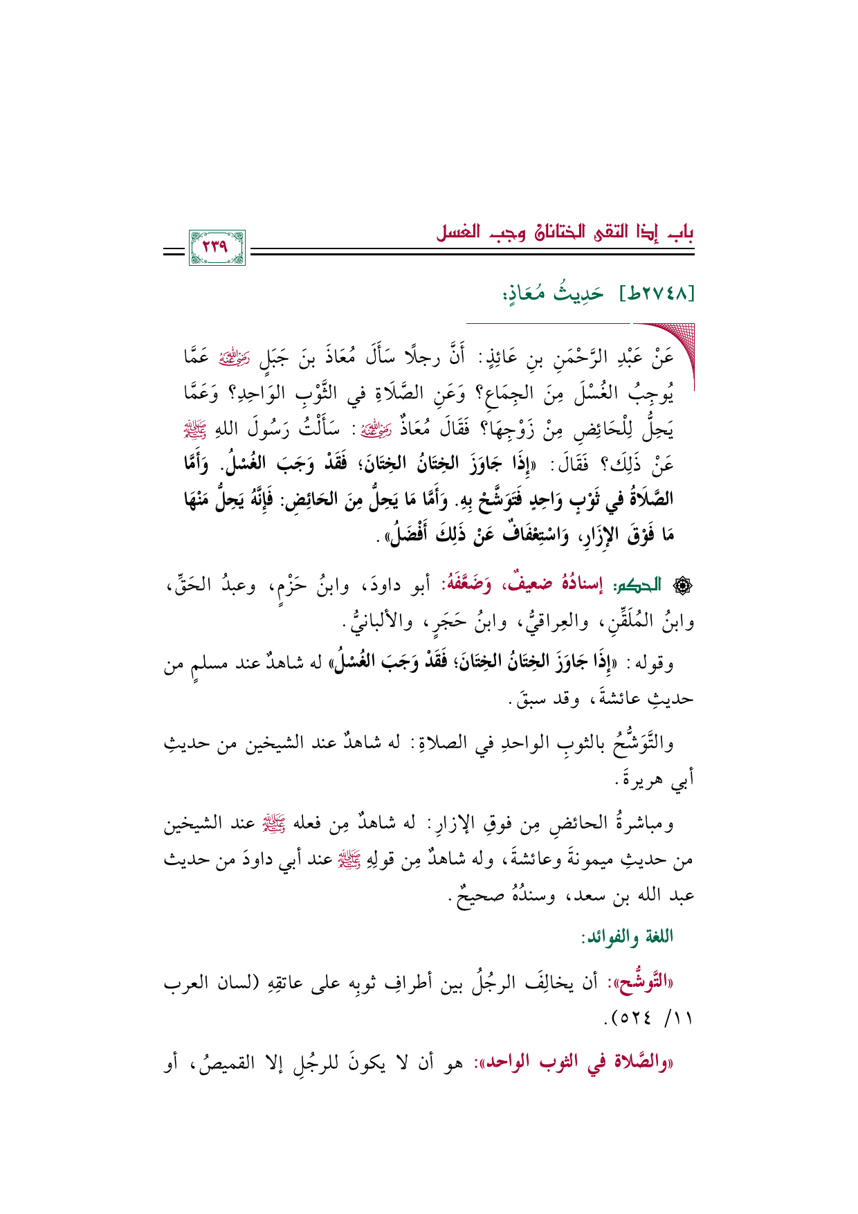 ◼ عَنْ عَبْدِ الرَّحْمَنِ بنِ عَائِذٍ: أَنَّ رجلًا سَأَلَ مُعَاذَ بنَ جَبَلٍ رضي الله عنه عَمَّا يُوجِبُ الغُسْلَ مِنَ الجِمَاعِ؟ وَعَنِ الصَّلَاةِ في الثَّوْبِ الوَاحِدِ؟ وَعَمَّا يَحِلُّ لِلْحَائِضِ مِنْ زَوْجِهَا؟ فَقَالَ مُعَاذٌ رضي الله عنه: سَأَلْتُ رَسُولَ اللهِ صلى الله عليه وسلم عَنْ ذَلِكَ؟ فَقَالَ: ((إِذَا جَاوَزَ الخِتَانُ الخِتَانَ؛ فَقَدْ وَجَبَ الغُسْلُ. وَأَمَّا الصَّلَاةُ في ثَوْبٍ وَاحِدٍ فَتَوَشَّحْ بِهِ. وَأَمَّا مَا يَحِلُّ مِنَ الحَائِضِ: فَإِنَّهُ يَحِلُّ مَنْهَا مَا فَوْقَ الإِزَارِ، وَاسْتِعْفَافٌ عَنْ ذَلِكَ أَفْضَلُ)).