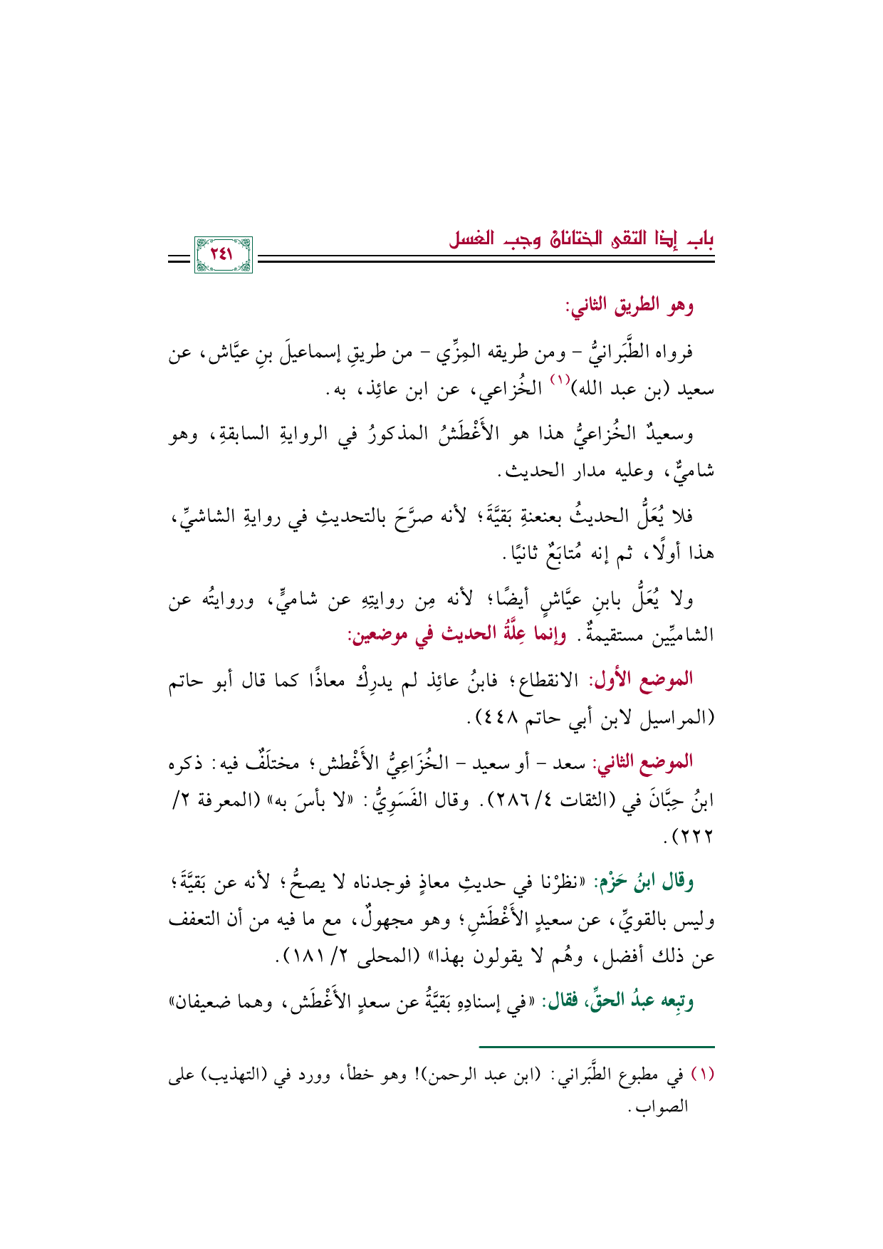 ولا يُعَلُّ بابنِ عيَّاشٍ أيضًا؛ لأنه مِن روايتِهِ عن شاميٍّ، وروايتُه عن الشاميِّين مستقيمةٌ. وإنما عِلَّةُ الحديث في موضعين: