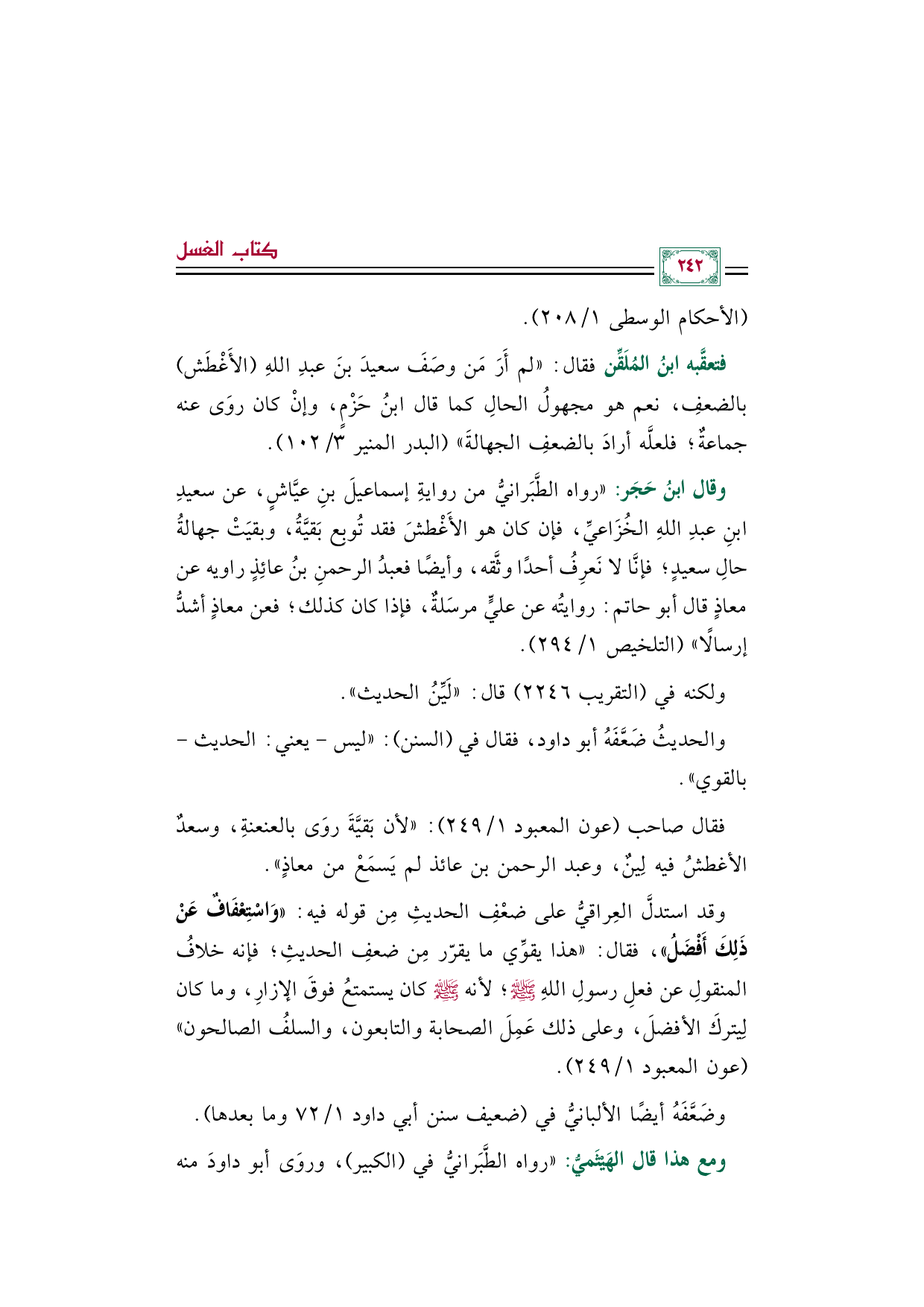 فتعقَّبه ابنُ المُلَقِّن فقال: "لم أَرَ مَن وصَفَ سعيدَ بنَ عبدِ اللهِ (الأَغْطَش) بالضعفِ، نعم هو مجهولُ الحالِ كما قال ابنُ حَزْمٍ، وإنْ كان روَى عنه جماعةٌ؛ فلعلَّه أرادَ بالضعفِ الجهالةَ" (البدر المنير ٣/ ١٠٢).