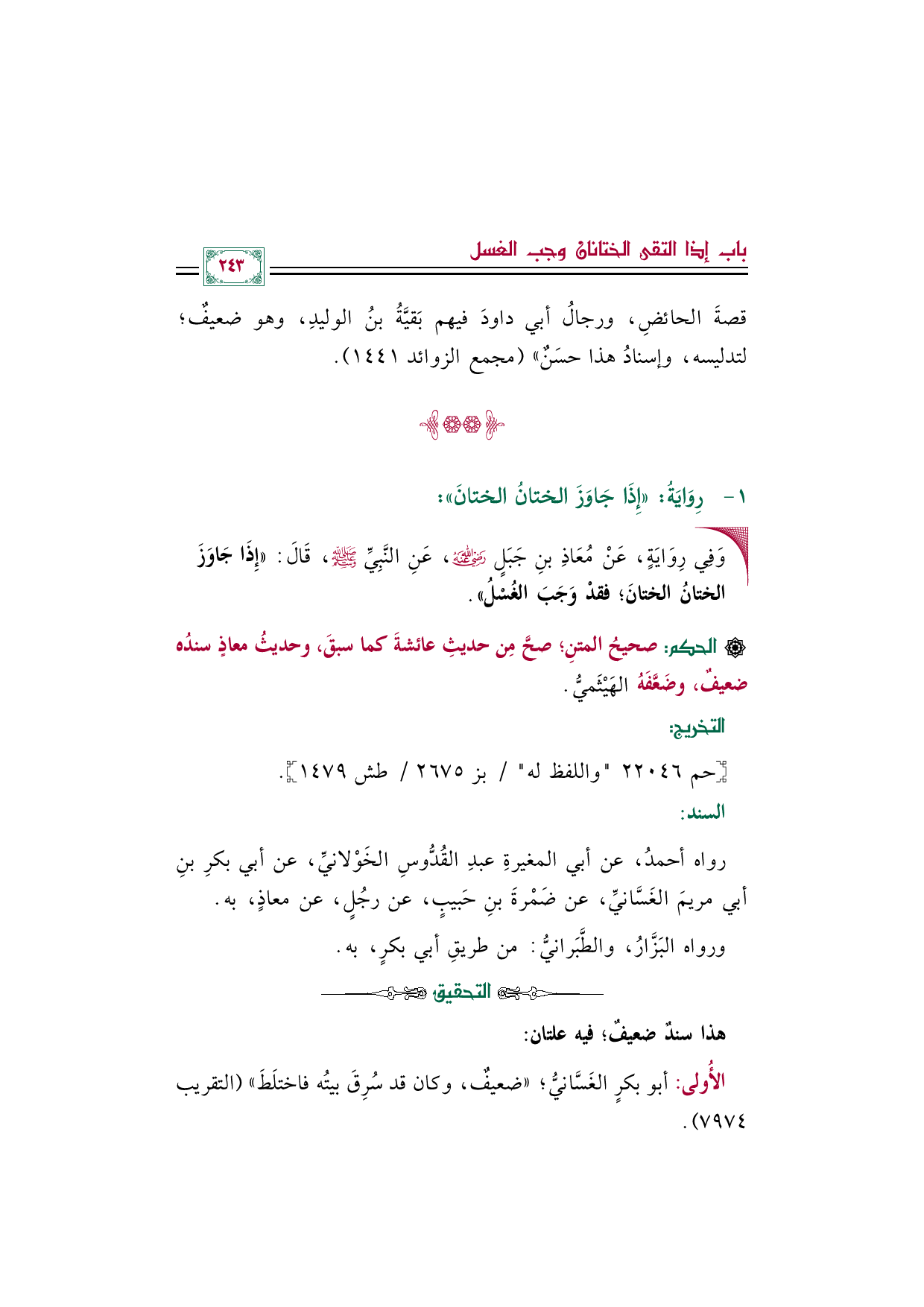 رواه أحمدُ، عن أبي المغيرةِ عبدِ القُدُّوسِ الخَوْلانيِّ، عن أبي بكرِ بنِ أبي مريمَ الغَسَّانيِّ، عن ضَمْرةَ بنِ حَبيبٍ، عن رجُلٍ، عن معاذٍ، به.