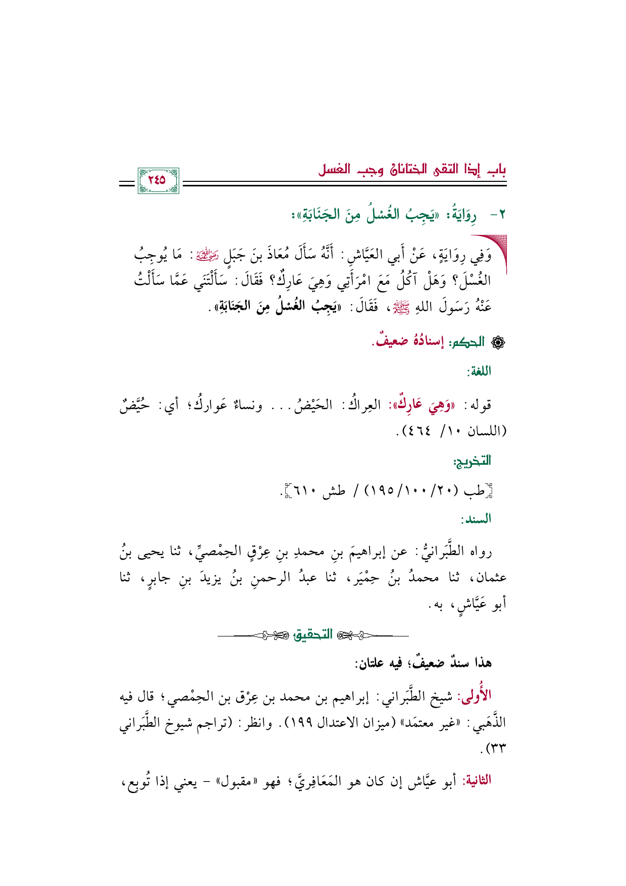 رواه الطَّبَرانيُّ: عن إبراهيمَ بنِ محمدِ بنِ عِرْقٍ الحِمْصيِّ، ثنا يحيى بنُ عثمان، ثنا محمدُ بنُ حِمْيَر، ثنا عبدُ الرحمنِ بنُ يزيدَ بنِ جابرٍ، ثنا أبو عَيَّاشٍ، به.