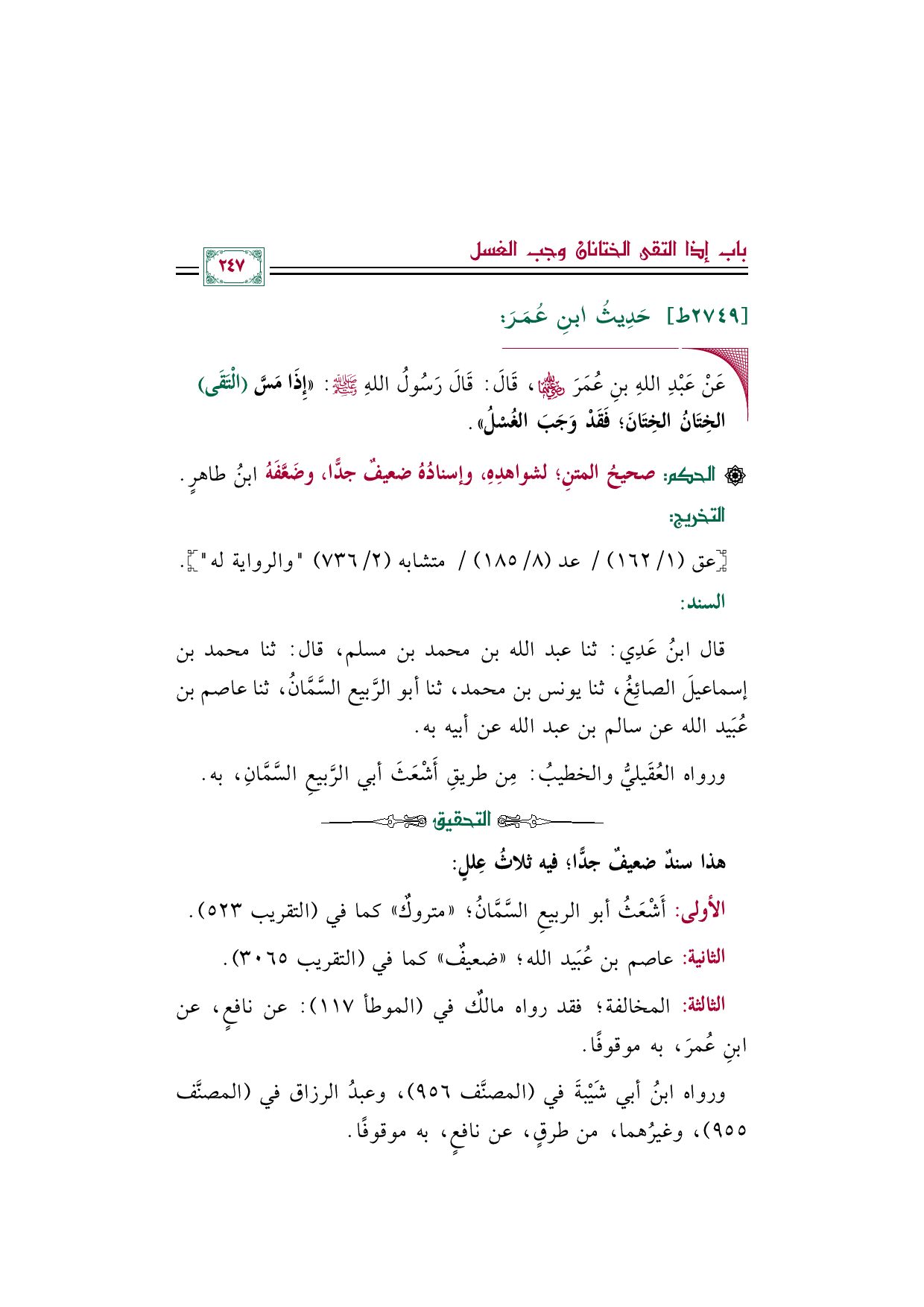 قال ابنُ عَدِي: ثنا عبد الله بن محمد بن مسلم، قال: ثنا محمد بن إسماعيلَ الصائِغُ، ثنا يونس بن محمد، ثنا أبو الرَّبيع السَّمَّانُ، ثنا عاصم بن عُبَيد الله عن سالم بن عبد الله عن أبيه به.