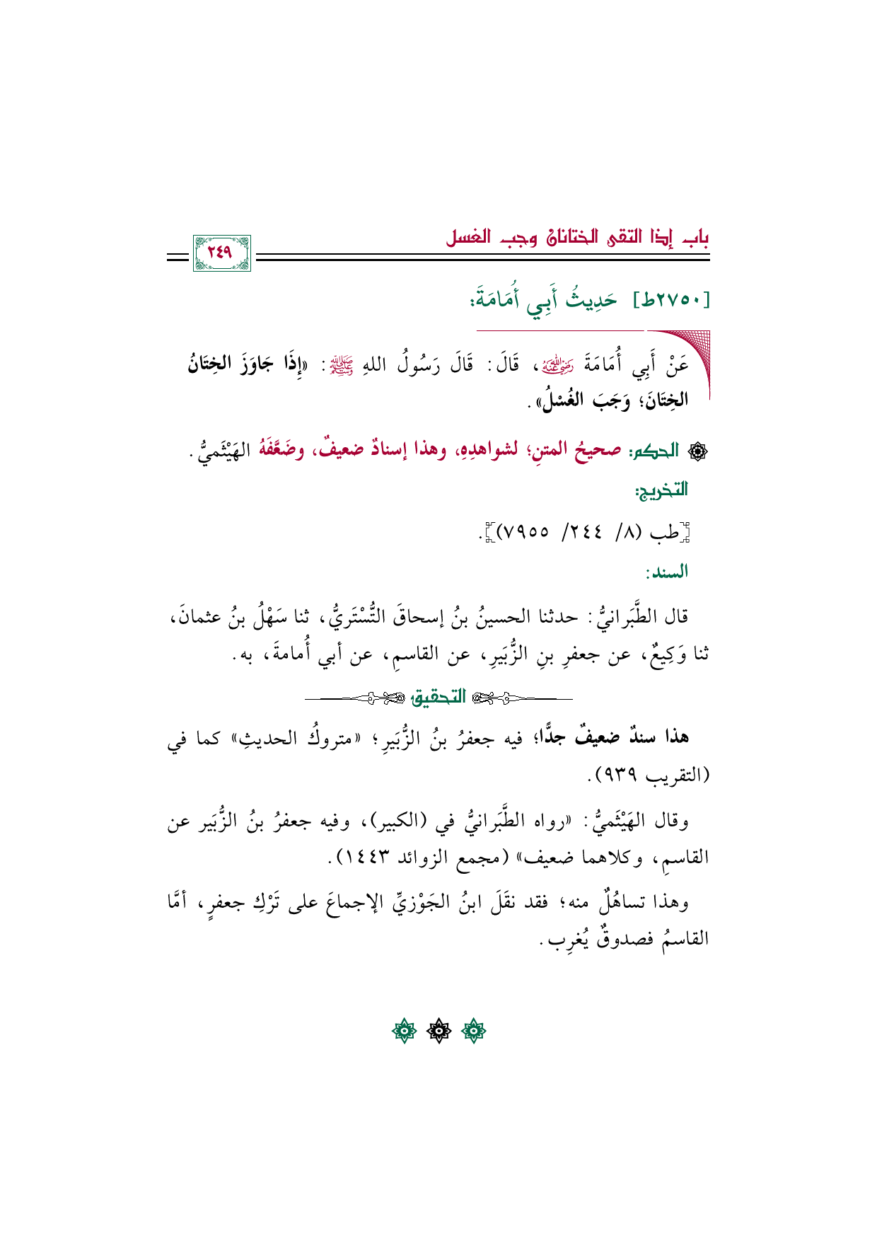 وقال الهَيْثَميُّ: "رواه الطَّبَرانيُّ في (الكبير)، وفيه جعفرُ بنُ الزُّبَير عن القاسمِ، وكلاهما ضعيف" (مجمع الزوائد ١٤٤٣).
