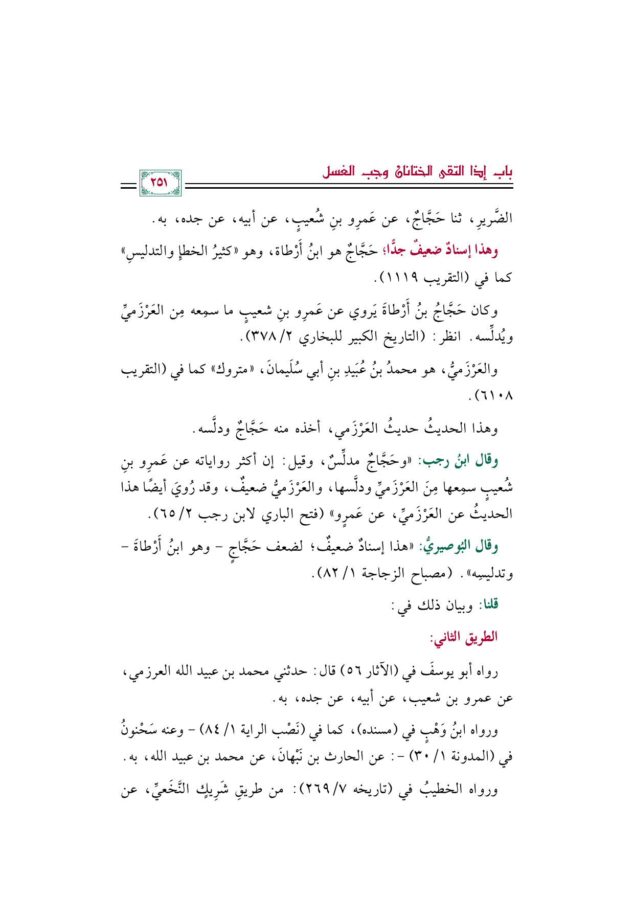 وقال ابنُ رجب: "وحَجَّاجٌ مدلِّسٌ، وقيل: إن أكثر رواياته عن عَمرِو بنِ شُعيبٍ سمِعها مِنَ العَرْزَميِّ ودلَّسها، والعَرْزَميُّ ضعيفٌ، وقد رُويَ أيضًا هذا الحديثُ عن العَرْزَميِّ، عن عَمرٍو" (فتح الباري لابن رجب ٢/ ٦٥).