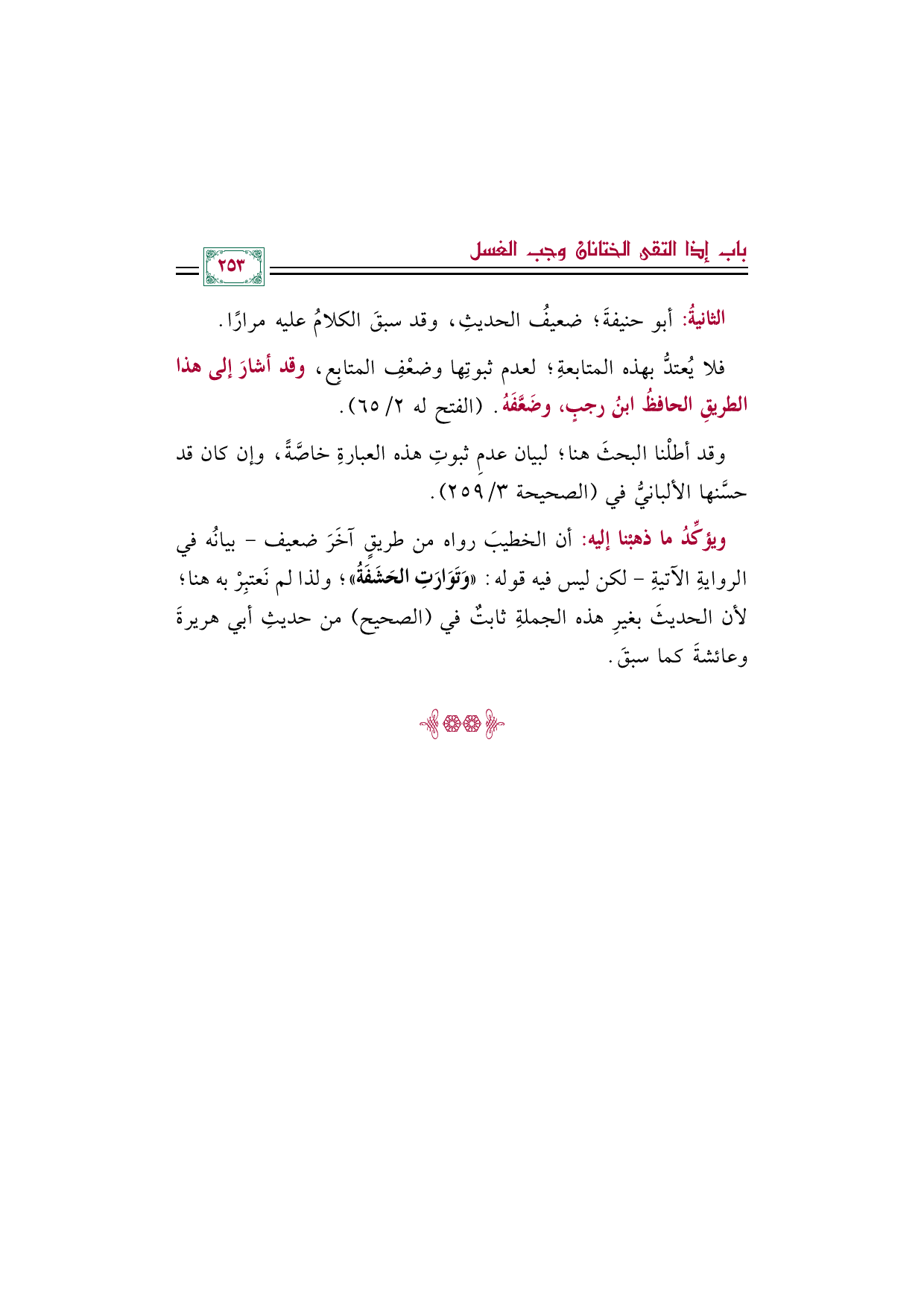ويؤكِّدُ ما ذهبْنا إليه: أن الخطيبَ رواه من طريقٍ آخَرَ ضعيف -بيانُه في الروايةِ الآتيةِ- لكن ليس فيه قوله: ((وَتَوَارَتِ الحَشَفَةُ))؛ ولذا لم نَعتبِرْ به هنا؛ لأن الحديثَ بغيرِ هذه الجملةِ ثابتٌ في (الصحيح) من حديثِ أبي هريرةَ وعائشةَ كما سبقَ.