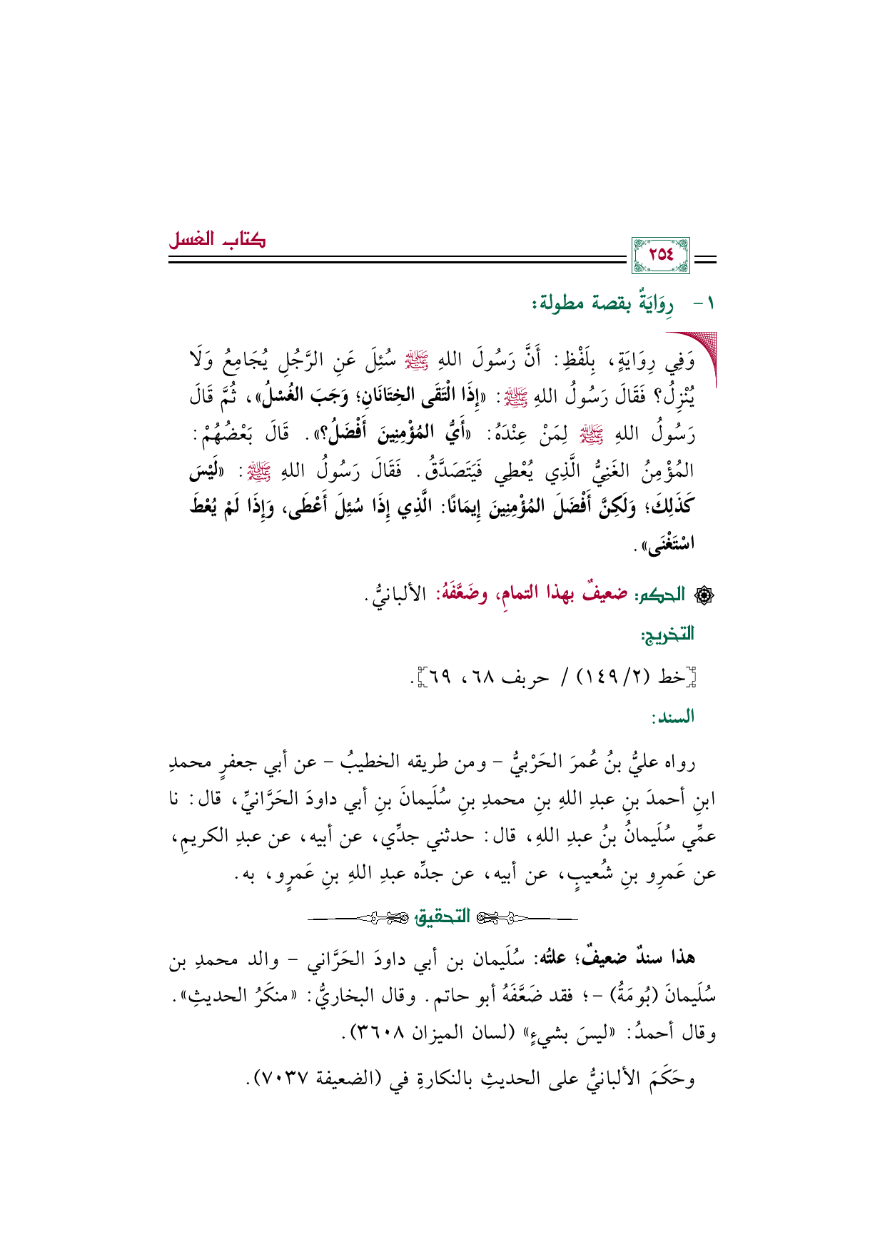 • وَفِي رِوَايَةٍ، بِلَفْظِ: أَنَّ رَسُولَ اللهِ صلى الله عليه وسلم سُئِلَ عَنِ الرَّجُلِ يُجَامِعُ وَلَا يُنْزِلُ؟ فَقَالَ رَسُولُ اللهِ صلى الله عليه وسلم: ((إِذَا الْتَقَى الخِتَانَانِ؛ وَجَبَ الغُسْلُ))، ثُمَّ قَالَ رَسُولُ اللهِ صلى الله عليه وسلم لِمَنْ عِنْدَهُ: ((أَيُّ المُؤْمِنِينَ أَفْضَلُ؟)). قَالَ بَعْضُهُمْ: المُؤْمِنُ الغَنِيُّ الَّذِي يُعْطِي فَيَتَصَدَّقُ. فَقَالَ رَسُولُ اللهِ صلى الله عليه وسلم: ((لَيْسَ كَذَلِكَ؛ وَلَكِنَّ أَفْضَلَ المُؤْمِنِينَ إِيمَانًا: الَّذِي إِذَا سُئِلَ أَعْطَى، وَإِذَا لَمْ يُعْطَ اسْتَغْنَى)).