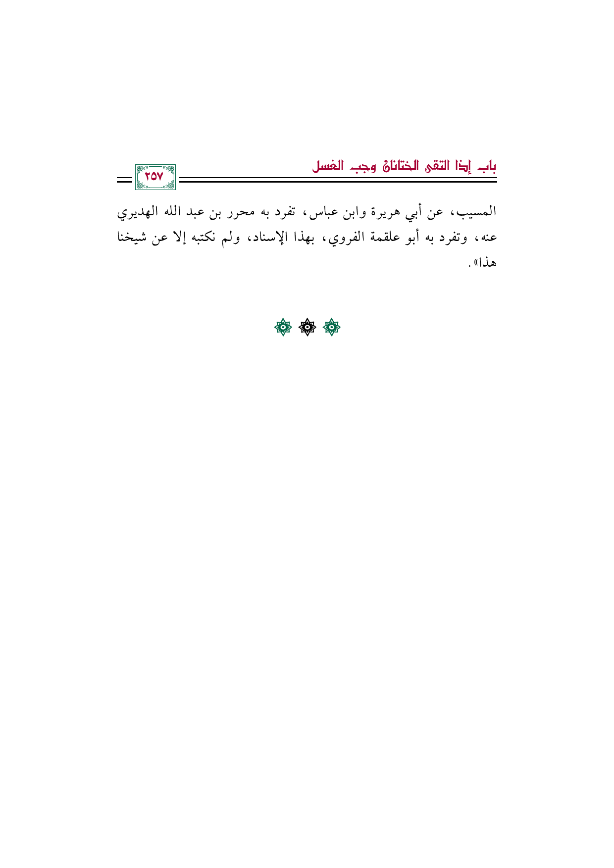 المسيب، عن أبي هريرة وابن عباس، تفرد به محرر بن عبد الله الهديري عنه، وتفرد به أبو علقمة الفروي، بهذا الإسناد، ولم نكتبه إلا عن شيخنا هذا".
